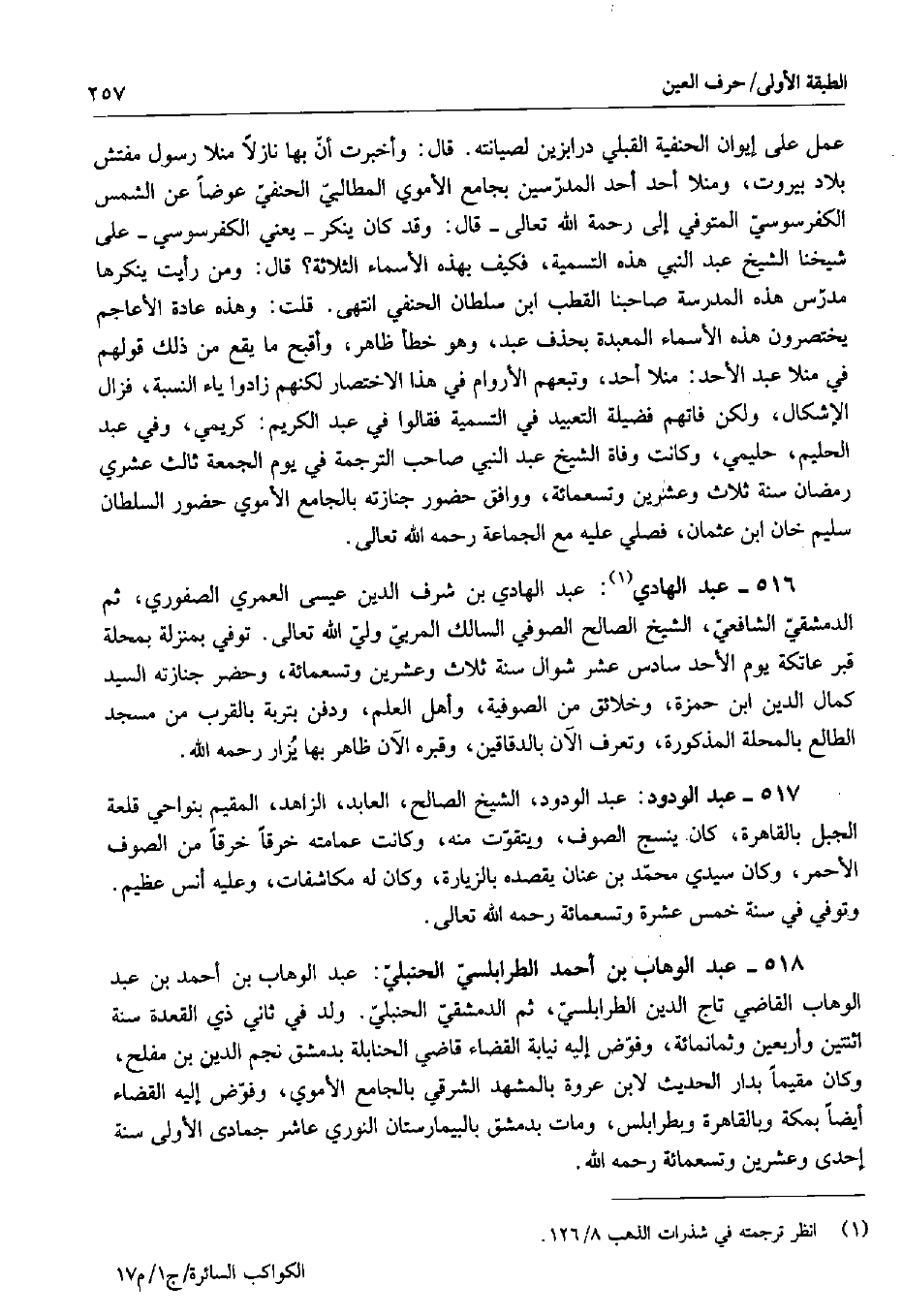 516 - عبد الهادي: عبد الهادي بن شرف الدين عيسى العمري الصفوري ثم الدمشقي الشافعي، الشيخ الصالح الصوفي السالك المربي ولي الله تعالى. توفي بمنزلة بمحلة قبر عاتكة يوم الأحد سادس عشر شوال سنة ثلاث وعشرين وتسعمائة، وحضر جنازته السيد كمال الدين ابن حمزة، وخلائق من الصوفية، وأهل العلم، ودفن بتربة بالقرب من مسجد الطالع بالمحلة المذكورة، وتعرف الآن بالدقاقين، وقبره الآن ظاهر بها يزار رحمه الله.