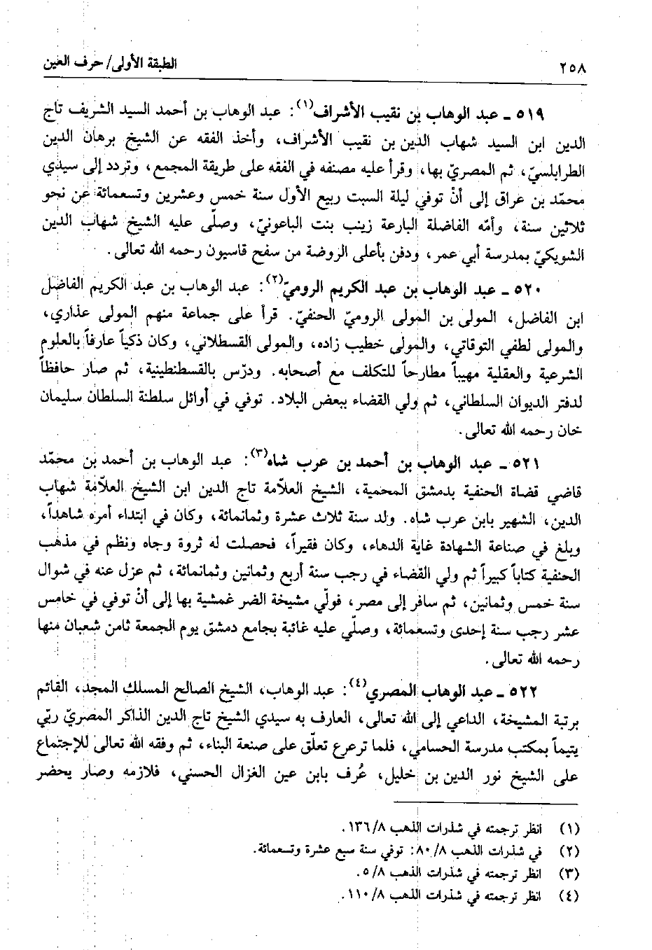 520 - عبد الوهاب بن عبد الكريم الرومي: عبد الوهاب بن عبد الكريم الفاضل ابن الفاضل، المولى بن المولى الرومي الحنفي. قرأ على جماعة منهم المولى عذاري، والمولى لطفي التوقاتي، والمولى خطيب زاده، والمولى القسطلاني، وكان ذكياً عارفاً بالعلوم الشرعية والعقلية مهيباً مطارحاً للتكلف مع أصحابه. ودرس بالقسطنطينية، ثم صار حافظاً لدفتر الديوان السلطاني، ثم ولي القضاء ببعض البلاد. توفي في أوائل سلطنة السلطان سليمان خان رحمه الله تعالى.