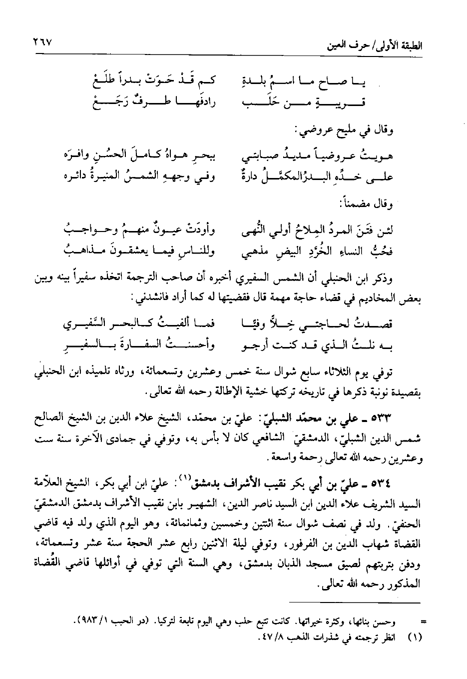 533 - علي بن محمد الشبلي: علي بن محمد، الشيخ علاء الدين بن الشيخ الصالح شمس الدين الشبلي، الدمشقي الشافعي كان لا بأس به، وتوفي في جمادى الآخرة سنة ست وعشرين رحمه الله تعالى رحمة واسعة.