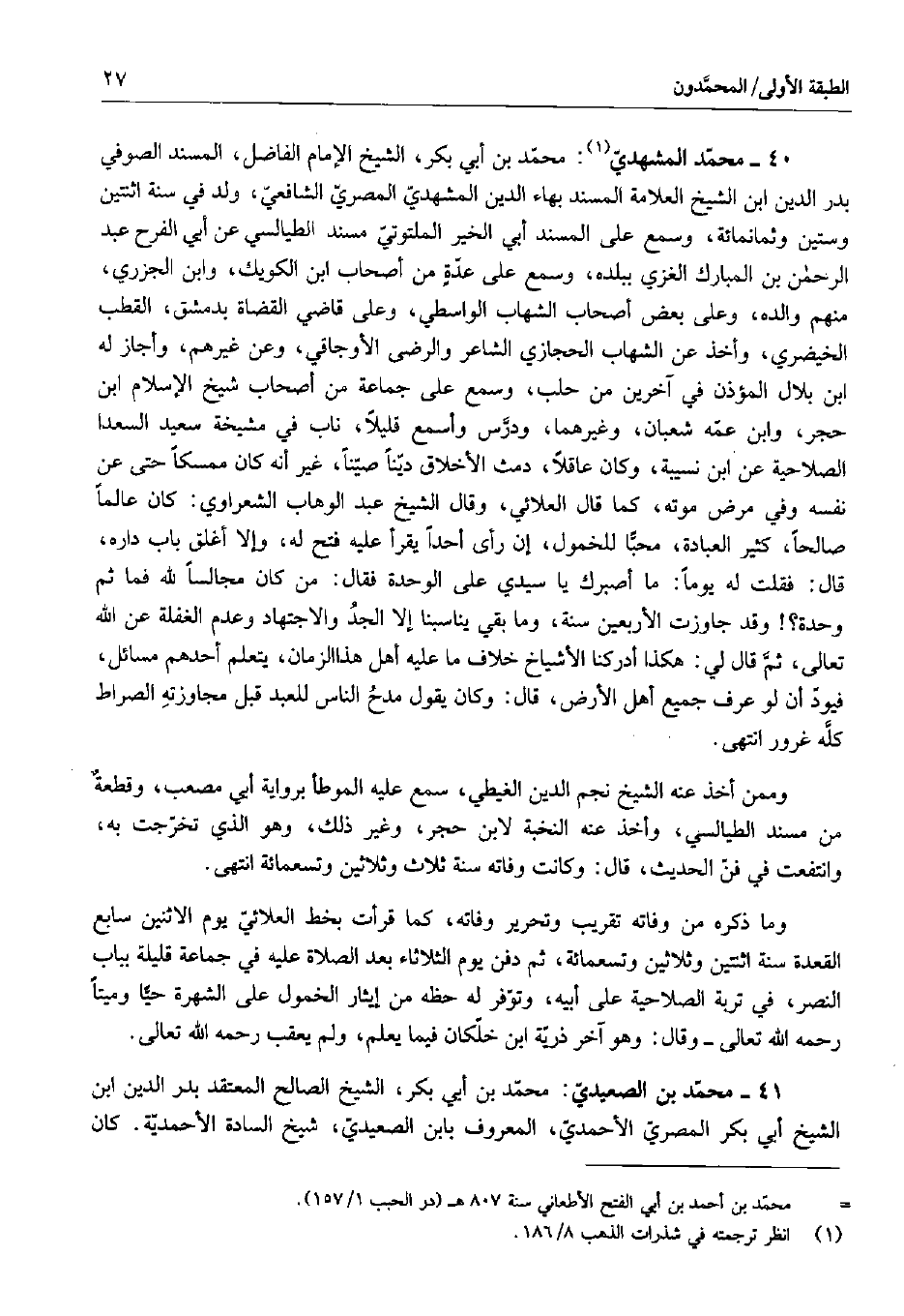 40 - محمد المشهدي: محمد بن أبي بكر، الشيخ الإمام الفاضل، المسند الصوفي بدر الدين ابن الشيخ العلامة المسند بهاء الدين المشهدي المصري الشافعي، ولد في سنة اثنتين وستين وثمانمائة، وسمع على المسند أبي الخير الملتوتي مسند الطيالسي عن أبي الفرح عبد الرحمن بن المبارك الغزي ببلده، وسمع على عدة من أصحاب ابن الكويك، وابن الجزري، منهم والده، وعلى بعض أصحاب الشهاب الواسطي، وعلى قاضي القضاة بدمشق، القطب الخيضري، وأخذ عن الشهاب الحجازي الشاعر والرضى الأوجاقي، وعن غيرهم، وأجاز له ابن بلال المؤذن في آخرين من حلب، وسمع على جماعة من أصحاب شيخ الإسلام ابن حجر، وابن عمه شعبان، وغيرهما، ودرس وأسمع قليلاً، ناب في مشيخة سعيد السعدا الصلاحية عن ابن نسيبة، وكان عاقلاً، دمث الأخلاق ديناً صيناً، غير أنه كان ممسكاً حتى عن نفسه وفي مرض موته، كما قال العلائي، وقال الشيخ عبد الوهاب الشعراوي: كان عالماً صالحاً، كثير العبادة، محباً للخمول، إن رأى أحداً يقرأ عليه فتح له، وإلا أغلق باب داره، قال: فقلت له يوماً: ما أصبرك يا سيدي على الوحدة فقال: من كان مجالساً لله فما ثم وحدة؟! وقد جاوزت الأربعين سنة، وما بقي يناسبنا إلا الجد والاجتهاد وعدم الغفلة عن الله تعالى، ثم قال لي: هكنا أدركنا الأشياخ خلاف ما عليه أهل هذ (االزمان، يتعلم أحدهم مسائل، فيود أن لو عرف جميع أهل الأرض، قال: وكانيقول مدح الناس للعبد قبل مجاوزته الصراط كله غرور انتهى.