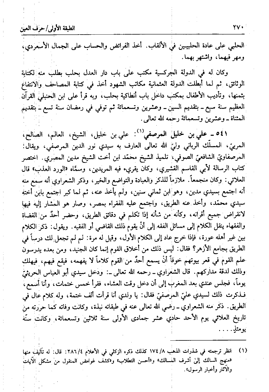 541 - علي بن خليل المرصفي: علي بن خليل، الشيخ، العالم، الصالح، المربي، المسلك الرباني ولي الله تعالى العارف به سيدي نور الدين المرصفي، ويقال: المرصفاوي الشافعي الصوفي، تلميذ الشيخ محمد ابن أخت الشيخ محين المصري. اختصر كتاب الرسالة لأبي القاسم القشيري، وكان يقريء فيه المريدين، وسماه " الورد العذب " قال العلائي: وكان منجمعاً. ملازماً للذكر والعبادة والتواضع والخير، وذكر الشعراوي أنه سمع منه أنه اجتمع بسيدي مدين، وهو ابن ثماني سنين، ولم يأخذ عنه، ثم لما كبر اجتمع بابن أخته سيدي محمد، وأخذ عنه الطريق، واجتمع عليه الفقراء بمصر، وصار هو المشار إليه فيها لانقراض جميع أقرانه، وكأنه من شأنه إذا تكلم في دقائق الطريق، وحضر أحد من القضاة والفقهاء ينقل الكلام إلى مسائل الفقه إلى أن يقوم ذلك القاضي أو الفقيه. ويقول: ذكر الكلام بين غير أهله عورة، فإذا خرج عاد إلى الكلام الأول، وقيل له مرة: لم لم تجعل لك درساً في الطريق بجامع الأزهر؟ فقال: ليس ذلك من أخلاق القوم إنما كان الجنيد، ومن بعده يدرسون علم القوم في قعر بيوتهم خوفاً أن يسمع أحد من القوم كلاماً لا يفهمه، فيقع فيهم، فيهلك وذلك لدقة مداركهم. قال الشعراوي - رحمه الله تعالى -: ودخل سيدي أبو العباس الحريثي يوماً، فجلس عندي بعد المغرب إلى أن دخل وقت العشاء، فقرأ خمس ختمات، وأنا أسمع، فذكرت ذلك لسيدي علي المرصفي فقال: يا ولدي أنا قرأت ألف ختمة، وله كلام عال في الطريق. ذكر منه الشعراوي - رضي الله تعالى عنه في طبقاته نبذة، وكانت وفاته كما حررته من تاريخ العلائي يوم الأحد حادي عشر جمادى الأولى سنة ثلاثين وتسعمائة، وكانت سنه يومئذ....