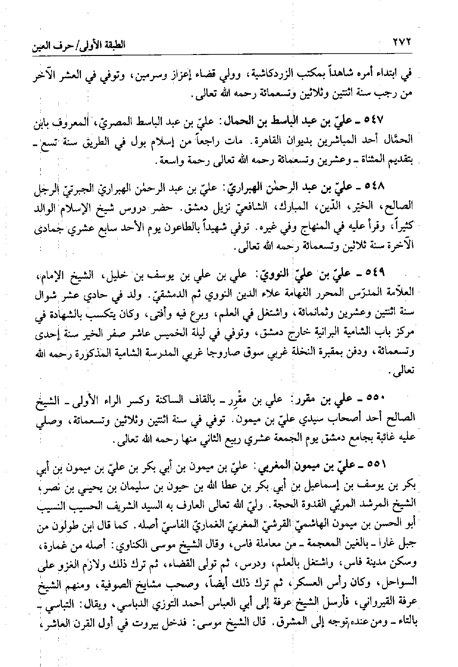 550 - علي بن مقرر: علي بن مقرر - بالقاف الساكنة وكسر الراء الأولى - الشيخ الصالح أحد أصحاب سيدي علي بن ميمون. توفي في سنة اثنتين وثلاثين وتسعمائة، وصلي عليه غائبة بجامع دمشق يوم الجمعة عشري رييع الثاني منها رحمه الله تعالى.