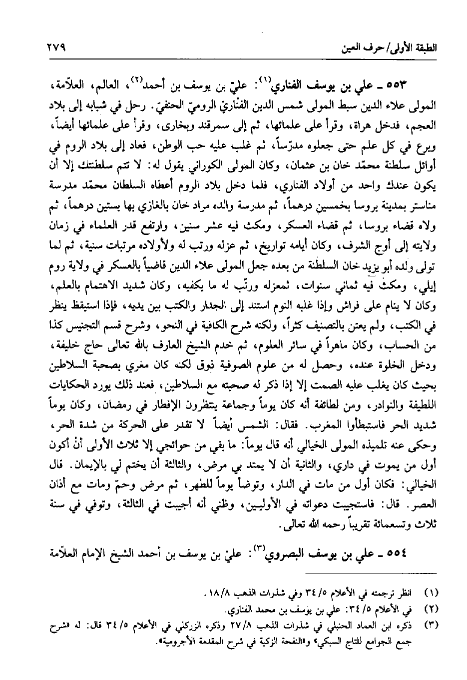 553 - علي بن يوسف الفناري: علي بن يوسف بن أحمد، العالم، العلامة، المولى علاء الدين سبط المولى شمس الدين الفناري الرومي الحنفي. رحل في شبابه إلى بلاد العجم، فدخل هراة، وقرأ على علمائها، ثم إلى سمرقند وبخارى، وقرأ على علمائها أيضاً، وبرع في كل علم حتى جعلوه مدرساً، ثم غلب عليه حب الوطن، فعاد إلى بلاد الروم في أوائل سلطنة محمد خان بن عثمان، وكان المولى الكوراني يقول له: لا تتم سلطتك إلا أن يكون عندك واحد من أولاد الفناري، فلما دخل بلاد الروم أعطاه السلطان محمد مدرسة مناستر بمدينة بروسا بخمسين درهماً، ثم مدرسة والده مراد خان بالغازي بها بستين درهماً، ثم ولاه قضاء بروسا، ثم قضاء العسكر، ومكث فيه عشر سنين، وارتفع قدر العلماء في زمان ولايته إلى أوج الشرف، وكان أيامه تواريخ، ثم عزله ورتب له ولأولاده مرتبات سنية، ثم لما تولى ولده أبو يزيد خان السلطنة من بعده جعل المولى علاء الدين قاضياً بالعسكر في ولاية روم إيلي، ومكث فيه ثماني سنوات، ثم عزله ورتب له ما يكفيه، وكان شديد الاهتمام بالعلم، وكان لا ينام على فراش وإذا غلبه النوم استند إلى الجدار والكتب بين يديه، فإذا استيقظ ينظر في الكتب، ولم يعتن بالتصنيف كثراً، ولكنه شرح الكافية في النحو، وشرح قسم التجنيس كذا من الحساب، وكان ماهراً في سائر العلوم، ثم خدم الشيخ العارف بالله تعالى حاج خليفة، ودخل الخلوة عنده، وحصل له من علوم الصوفية فوق لكنه كان مغري بصحبة السلاطين بحيث كان يغلب عليه الصمت إلا إذا ذكر له صحبته مع السلاطين، فعند ذلك يورد الحكايات اللطيفة والنوادر، ومن لطائفة أنه كان يوماً وجماعة ينتظرون الإفطار في رمضان، وكان يوماً شديد الحر فاستبطأوا المغرب. فقال: الشمس أيضاً لا تقدر على الحركة من شدة الحر، وحكى عنه تلميذه المولى الخيالي أنه قال يوماً: ما بقي من حوائجي إلا ثلاث الأولى أن أكون أول من يموت في داري، والثانية أن لا يمتد بي مرض، والثالثة أن يختم لي بالإيمان. قال الخيالي: فكان أول من مات في الدار، وتوضأ يوماً للطهر، ثم مرض وحم ومات مع أذان العصر. قال: فاستجيبت دعواته في الأوليين، وظني أنه أجيبت في الثالثة، وتوفي في سنة ثلاث وتسعمائة تقريباً رحمه الله تعالى.