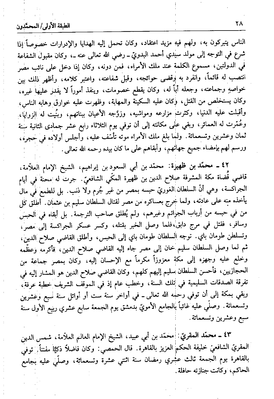 42 - محمد بن ظهيرة: محمد بن أبي السعود بن إبراهيم، الشيخ الإمام العلامة، قاضي قضاة مكة المشرفة صلاح الدين بن ظهيرة المكي الشافعي. جرت له محنة في أيام الجراكسة، وهي أن السلطان الغوري حبسه بمصر من غير جرم ولا ذنب. بل للطمع في مال يأخذه منه على عادته، ولما خرج بعساكره من مصر لقتال السلطان سليم بن عثمان. أطلق كل من في حبسه من أرباب الجرائم وغيرهم، ولم يطلق صاحب الترجمة. بل أبقاه في الحبس، وسافر، فقتل في مرج دابق، فلما وصل الخبر بقتله، وكسر عسكر الجراكسة إلى مصر، وتسلطن طومان باي. توجه السلطان طومان باي إلى الحبس، وأطلق القاضي صلاح الدين، ثم لما وصل السلطان سليم خان إلى مصر جاء إليه القاضي صلاح الدين، فاكرمه وعظمه وخلع عليه وجهزه إلى مكة معزوزاً مكرماً مع الإحسان إليه، وكان بمصر جماعة من الحجازيين، فأحسن السلطان سليم إليهم كلهم، وكان القاضي صلاح الدين هو المشار إليه في تفرقة الصدقات السليمية في تلك السنة، وخطب عام إذ في الموقف الشريف خطبة عرفة، وبقي بمكة إلى أن توفي رحمه الله تعالى - في أواخر سنة ست أو أوائل سنة سبع وعشرين وتسعمائة. وصلي عليه غائباً بالجامع الأموي بدمشق يوم الجمعة سابع عشري ربيع الأول سنة وعشرين وتسعمائة.