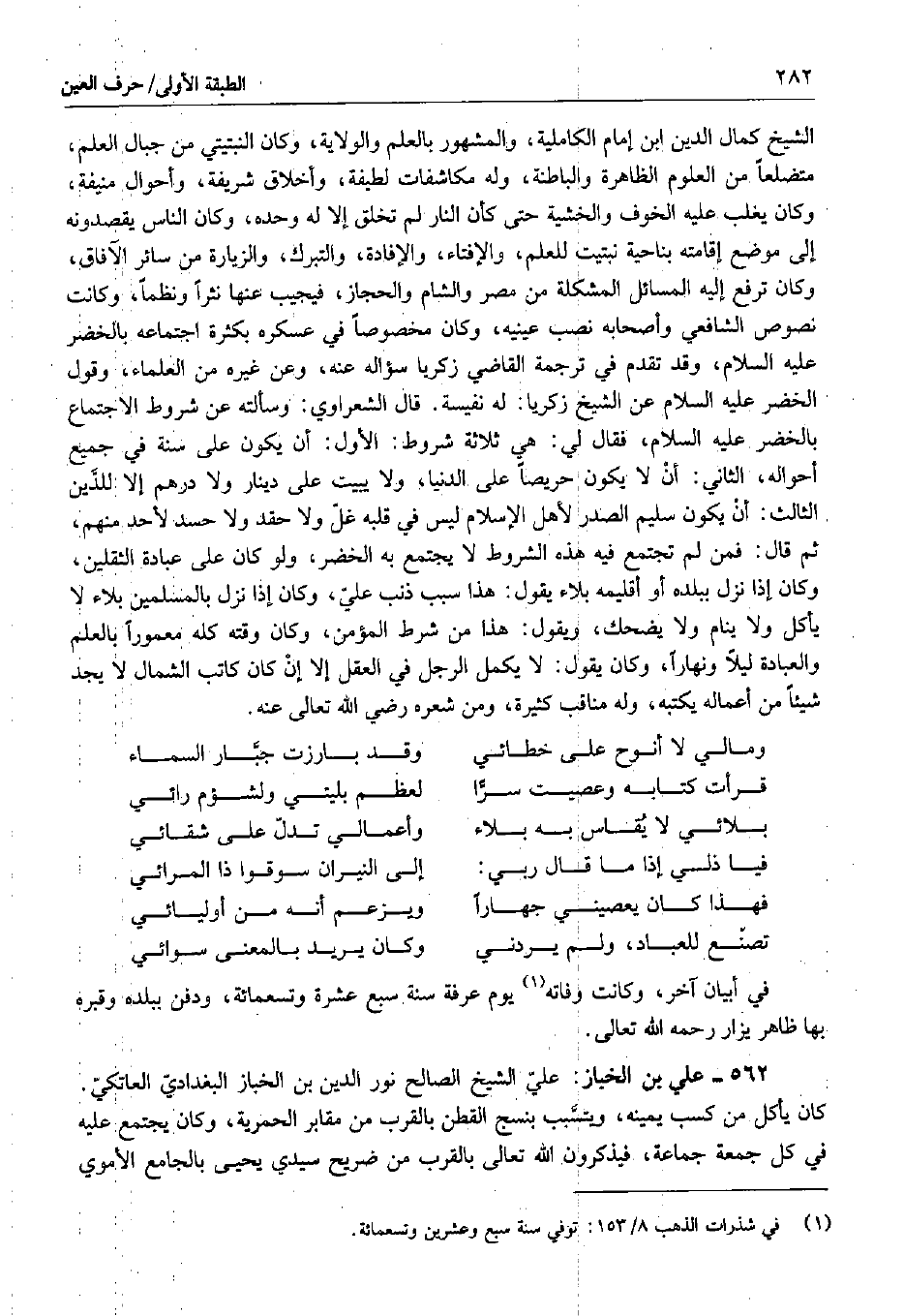 562 - علي بن الخباز: علي الشيخ الصالح نور الدين بن الخباز البغدادي العاتكي. كان يأكل من كسب يمينه، ويتسبب بنسج القطن بالقرب من مقابر الحمرية، وكان يجتمع عليه في كل جمعة جماعة، فيذكرون الله تعالى بالقرب من ضريح سيدي يحيى بالجامع الأموي