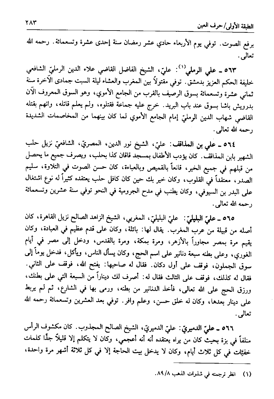 566 - علي الدميري: علي الدميري، الشيخ الصالح المجذوب. كان مكشوف الرأس منلفاً في بزة بحيث كان من يراه يعتقده أنه أنه أعجمي، وكان لا يتكلم إلا قليلاً جداً كلمات خفيات في كل ثلاث أيام، وكان لا يدخل بيت الحاجة إلا في كل ثلائة أشهر مرة واحدة،