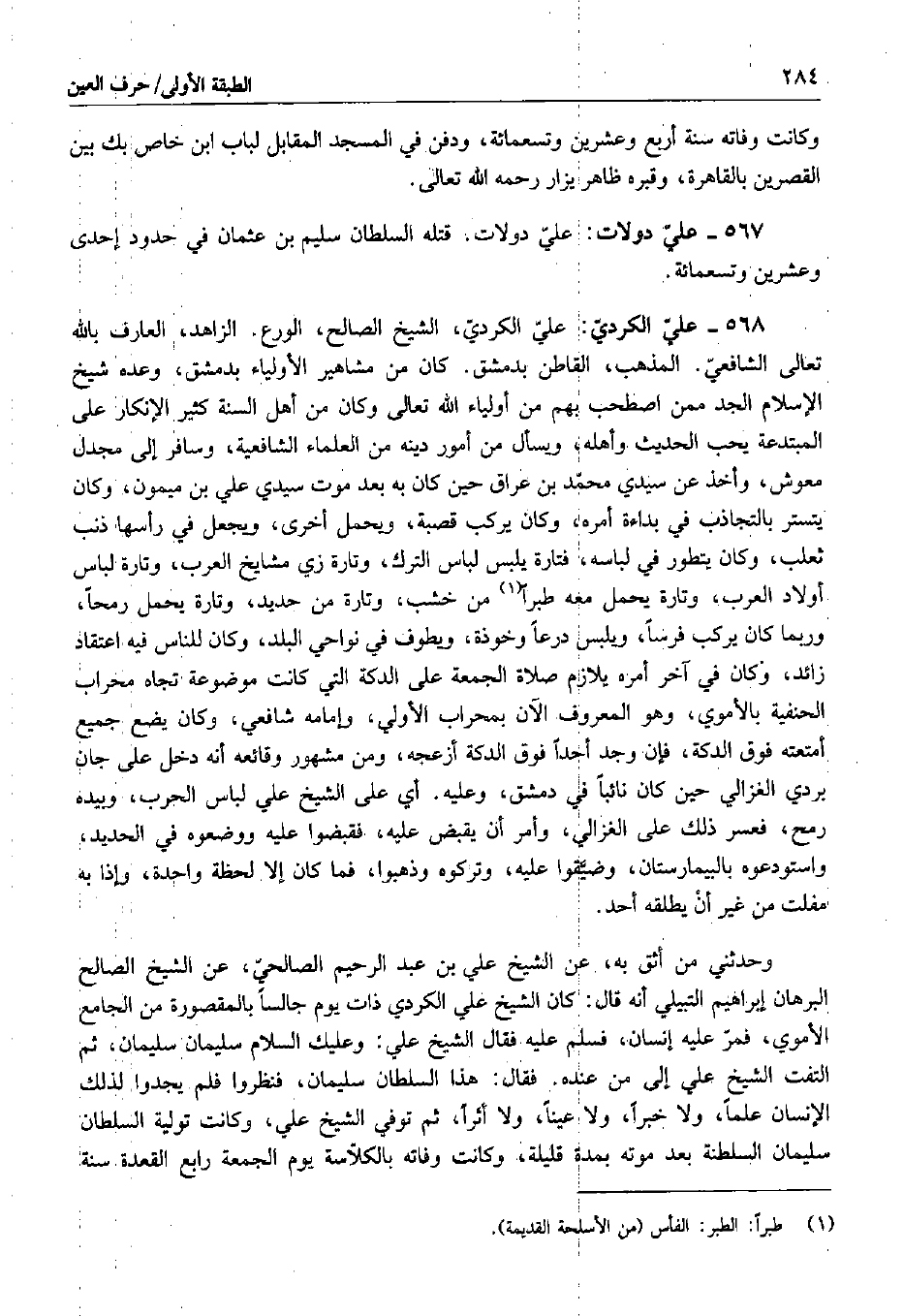 568 - علي الكردي: علي الكردي، الشيخ الصالح، الورع. الزاهد، العارف بالله تعالى الشافعي. المذهب، القاطن بدمشق. كان من مشاهير الأولياء بدمشق، وعمه شيخ الإسلام الجد ممن اصطحب بهم من أولياء الله تعالى وكان من أهل السنة كثير الإنكار على المبتدعة يحب الحديث وأهله، ويسأل من أمور دينه من العلماء الشافعية، وسافر إلى مجدل معوش، وأخذ عن سيدي محمد بن عراق حين كان به بعد موت سيدي علي بن ميمون، وكان يتستر بالتجاذب في بداءة أمره، وكان يركب قصبة، ويحمل أخرى، ويجعل في رأسها ذنب ثعلب، وكان يتطور في لباسه، فتارة يلبس لباس الترك، وتارة زي مشايخ العرب، وتارة لباس أولاد العرب، وتارة يحمل معه طيراً من خشب، وتارة من حديد، وتارة يحمل رمحاً، وربما كان يركب فرساً، ويلبس درعاً وخوذة، ويطوف في نواحي البلد، وكان للناس فيه اعتقاد زائد، وكان في آخر أمره يلازم صلاة الجمعة على الدكة التي كانت موضوعة تجاه محراب الحنفية بالأموي، وهو المعروف الآن بمحراب الأولي، وإمامه شافعي، وكان يضع جميع أمتعته فوق الدكة، فإن وجد أحداً فوق الدكة أزعجه، ومن مشهور وقائعه أنه دخل على جان بردي الغزالي حين كان نائباً في دمشق، وعليه. أي على الشيخ علي لباس الحرب، وبيده رمح، فعسر ذلك على الغزالي، وأمر أن يقبض عليه، فقبضوا عليه ووضعوه في الحديد، واستودعوه بالبيمارستان، وضيقوا عليه، وتركوه وذهبوا، فما كان إلا لحظة واحدة، وإذا به مفلت من غير أن يطلقه أحد.