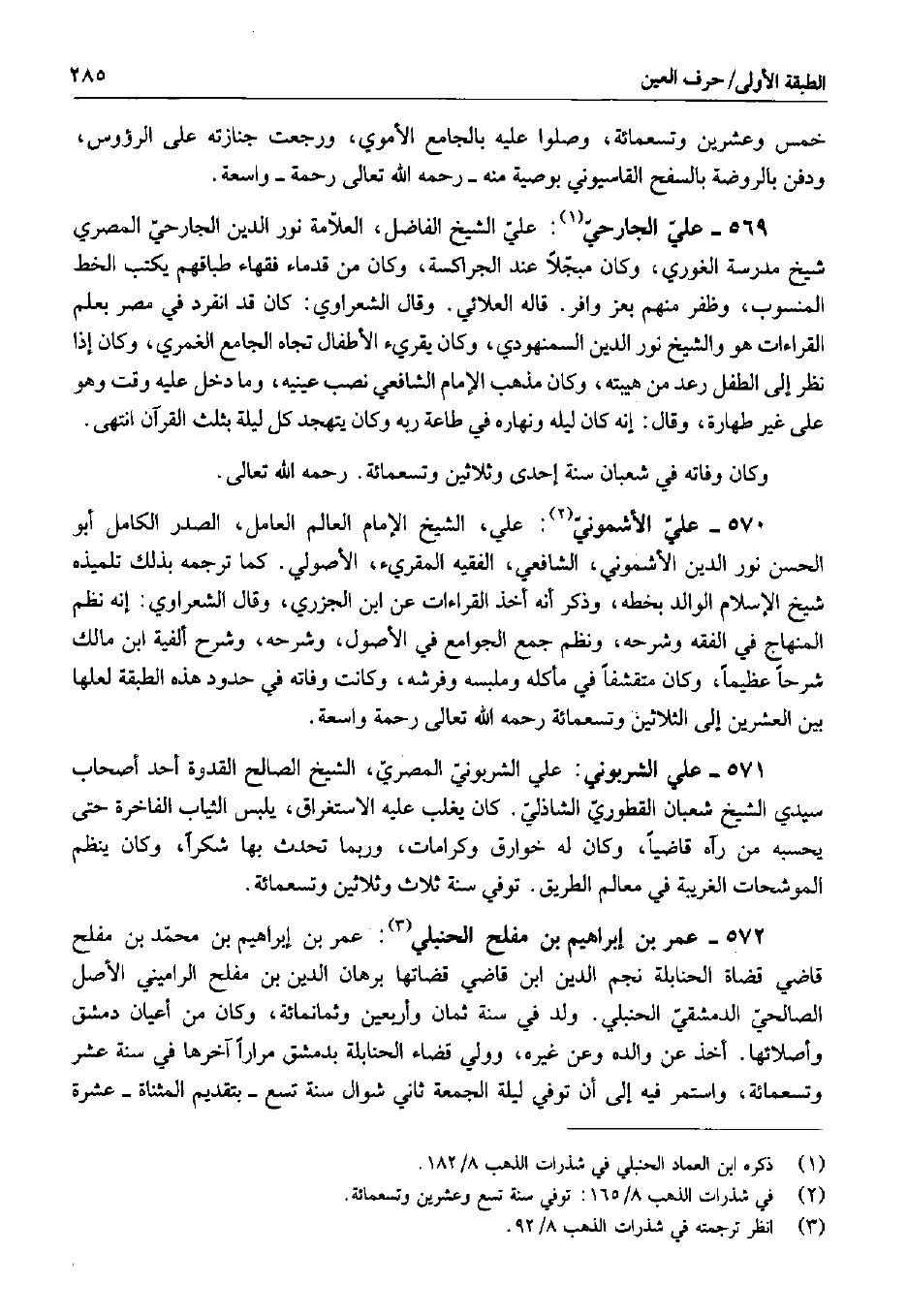 570 - علي الأشموني: علي، الشيخ الإمام العالم العامل، الصدر الكامل أبو الحسن نور الدين الأشموني، الشافعي، الفقيه المقريء، الأصولي. كما ترجمه بذلك تلميذه شيخ الإسلام الوالد بخطه، وذكر أنه أخذ القراءات عن ابن الجزري، وقال الشعراوي: إنه نظم المنهاج في الفقه وشرحه، ونظم جمع الجوامع في الأصول، وشرحه، وشرح ألفية ابن مالك شرحاً عظيماً، وكان متقشفاً في مأكله وملبسه وفرشه، وكانت وفاته في حدود هذه الطبقة لعلها بين العشرين إلى الثلاثين وتسعمائة رحمه الله تعالى رحمة واسعة.