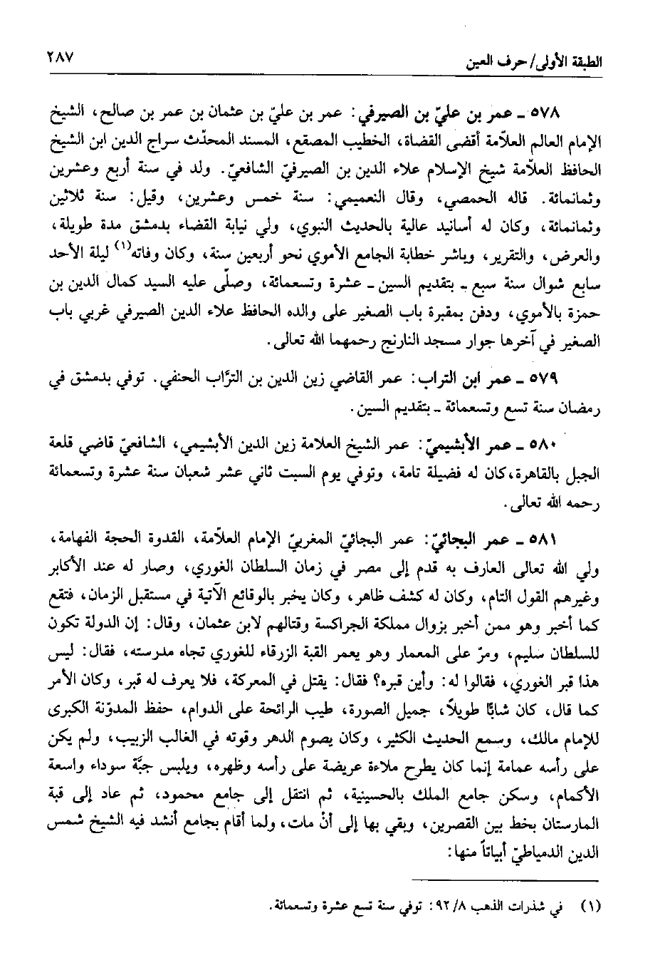 580 - عمر الأبشيمي: عمر الشيخ العلامة زين الدين الأبشيمي، الشافعي قاضي قلعة الجبل بالقاهرة، كان له فضيلة تامة، وتوفي يوم السبت ثاني عشر شعبان سنة عشرة وتسعمائة رحمه الله تعالى.