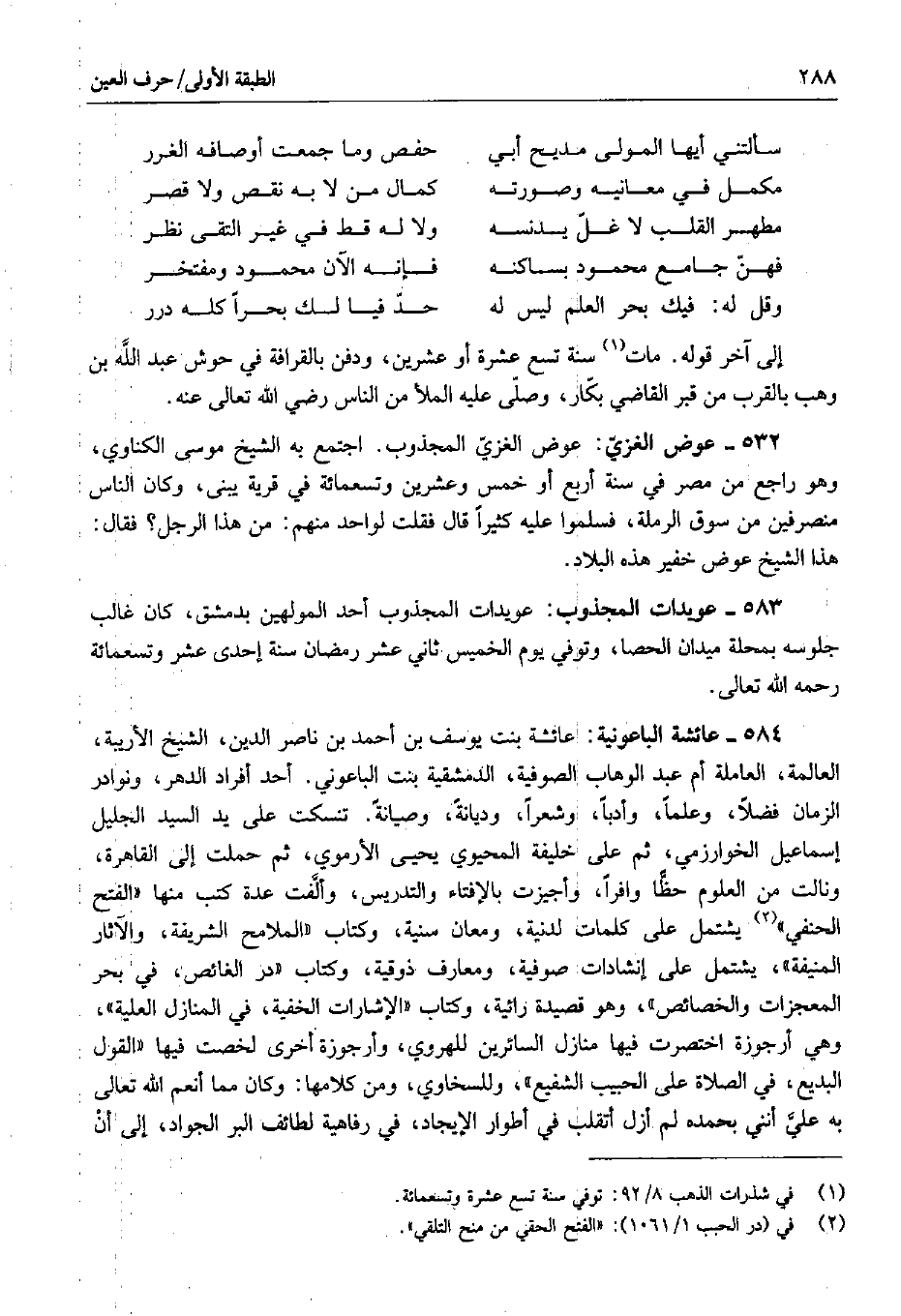 584 - عائشة الباعونية: عائشة بنت يوسف بن أحمد بن ناصر الدين، الشيخ الأريبة، العالمة، العاملة أم عبد الوهاب الصوفية، الدمشقية بنت الباعوني. أحد أفراد الدهر، ونوادر الزمان فضلاً، وعلماً، وأدباً، وشعراً، وديانةً، وصيانةً. تنسكت على يد السيد الجليل إسماعيل الخوارزمي، ثم على خليفة المحيوي يحيى الأرموي، ثم حملت إلى القاهرة، ونالت من العلوم حظاً وافراً، وأجيزت بالإفتاء والتدريس، وألفت عدة كتب منها " الفتح الحنفي " يشتمل على كلمات لدنية، ومعان سنية، وكتاب " الملامح الشريفة، والأثار المنيفة "، يشتمل على إنشادات صوفية، ومعارف ذوقية، وكتاب " در الغائص، في بحر المعجزات والخصائص "، وهو قصيدة رائية، وكتاب " الإشارات الخفية، في المنازل العلية "، وهي أرجوزة اختصرت فيها منازل السائرين للهروي، وأرجوزة أخرى لخصت فيها " القول البديع، في الصلاة على الحبيب الشفيع "، وللسخاوي، ومن كلامها: وكان مما أنعم الله تعالى به علي أنني بحمده لم أزل أتقلب في أطوار الإيجاد، في رفاهية لطائف البر الجواد، إلى أن