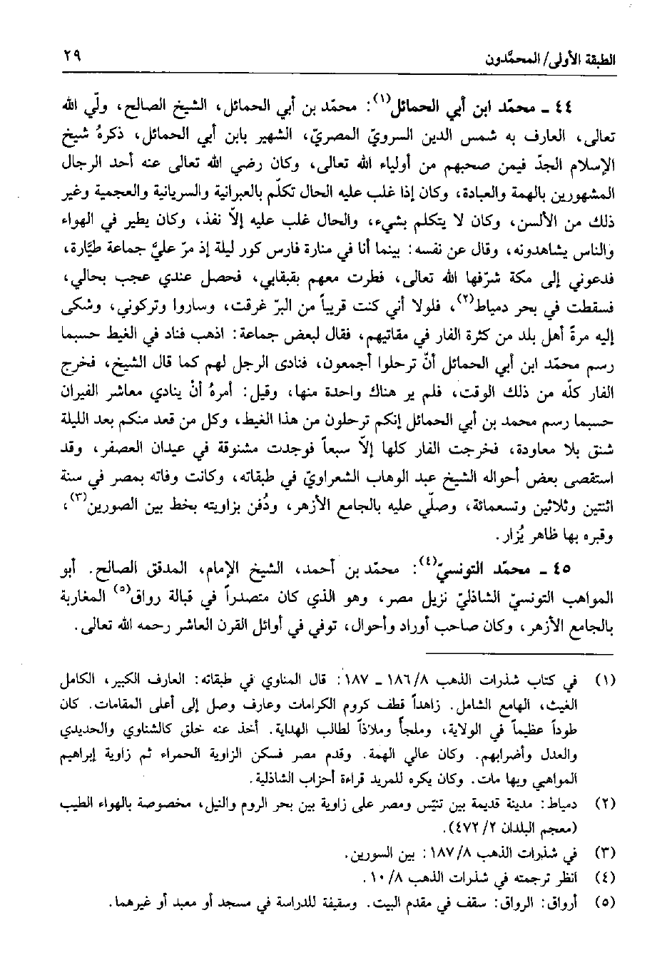 45 - محمد التونسي: محمد بن أحمد، الشيخ الإمام، المدقق الصالح. أبو المواهب التونسي الشاذلي نزيل مصر، وهو الذي كان متصدراً في قبالة رواق المغاربة بالجامع الأزهر، وكان صاحب أوراد وأحوال، توفي في أوائل القرن العاشر رحمه الله تعالى.