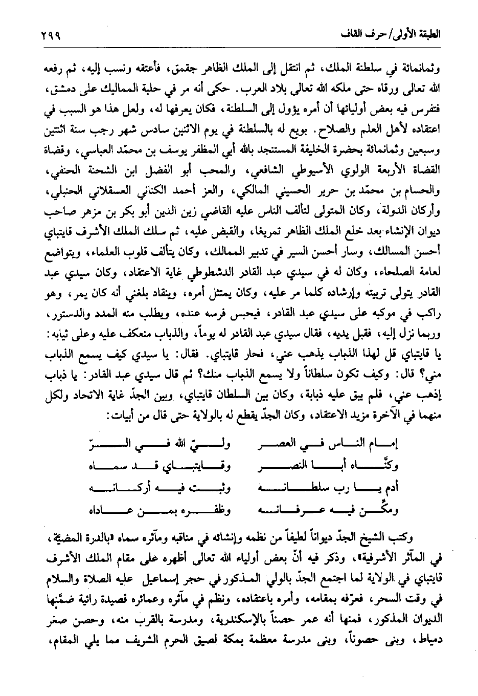 وثمانمائة في سلطنة الملك، ثم انتقل إلى الملك الظاهر جقمق، فأعتقه ونسب إليه، ثم رفعه الله تعالى ورقاه حتى ملكه الله تعالى بلاد العرب. حكى أنه مر في حلبة المماليك على دمشق فتفرس فيه بعض أوليائها أن أمره يؤول إلى السلطنة، فكان يعرفها له، ولعل هذا هو السبب في اعتقاله لأهل العلم والصلاح. بويع له بالسلطنة في يوم الاثنين سادس شهر رجب سنة اثنتين وسبعين وثمانمائة بحضرة الخليفة المستنجد بالله أبي المظفر يوسف بن محمد العباسي، وقضاة القضاة الأربعة الولوي الأسيوطي الشافعي، والمحب أبو الفضل ابن الشحنة الحنفي والحسام بن محمد بن حرير الحسيني المالكي، والعز أحمد الكناني العسقلاني الحنبلي وأركان الدولة، وكان المتولى لتألف الناس عليه القاضي زين الدين أبو بكر بن مزهر صاحب ديوان الإنشاء بعد خلع الملك الظاهر تمريغا، والقبض عليه، ثم سلك الملك الأشرف قايتباي أحسن المسالك، وسار أحسن السير فى تدبير الممالك، وكان يتألف قلوب العلماء، ويتواضع لعامة الصلحاء، وكان له في سيدي عبد القادر الدشطوطي غاية الاعتقاد، وكان سيدي عبد القادر يتولى تربيته وإرشاده كلما مر عليه، وكان يمتثل أمره، وينقاد بلغني أنه كان يمر، وهو راكب في موكبه على سيدي عبد القادر، فيحبس فرسه عنده، ويطلب منه المدد والدستور وربما نزل إليه، فقبل يديه، فقال سيدي عبد القادر له يوماً، والذباب منعكف عليه وعلى ثيابه يا قايتباي قل لهذا الذباب يذهب عني، فحار تايتباي. فقال: يا سيدي كيف يسمع الذباب مني؟ قال: وكيف تكون سلطاناً ولا يسمع الذباب منك؟ ثم قال سيدي عبد القادر: يا ذباب إذهب عني، فلم يبق عليه ذبابة، وكان بين السلطان قايتباي، وبين الجد غاية الاتحاد ولكل منهما في الآخرة مزيد الاعتقاد، وكان الجد يقطع له بالولاية حتى قال من أبيات: