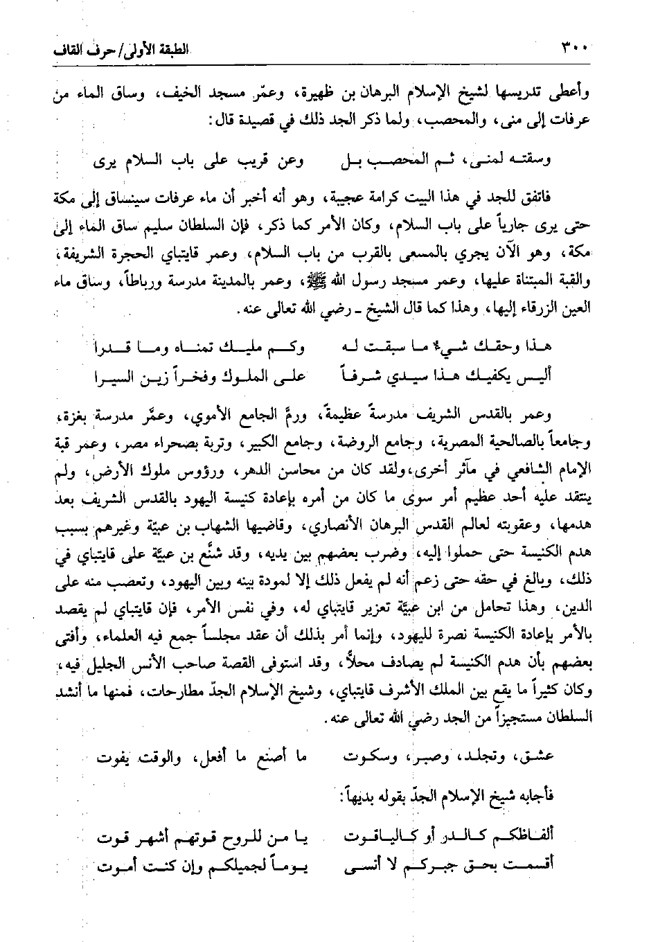 وأعطى تدريسها لشيخ الإسلام البرهان بن ظهيرة، وعمر مسجد الخيف، وساق الماء من عرفات إلى منى، والمحصب، ولما ذكر الجد ذلك في قصيدة قال: