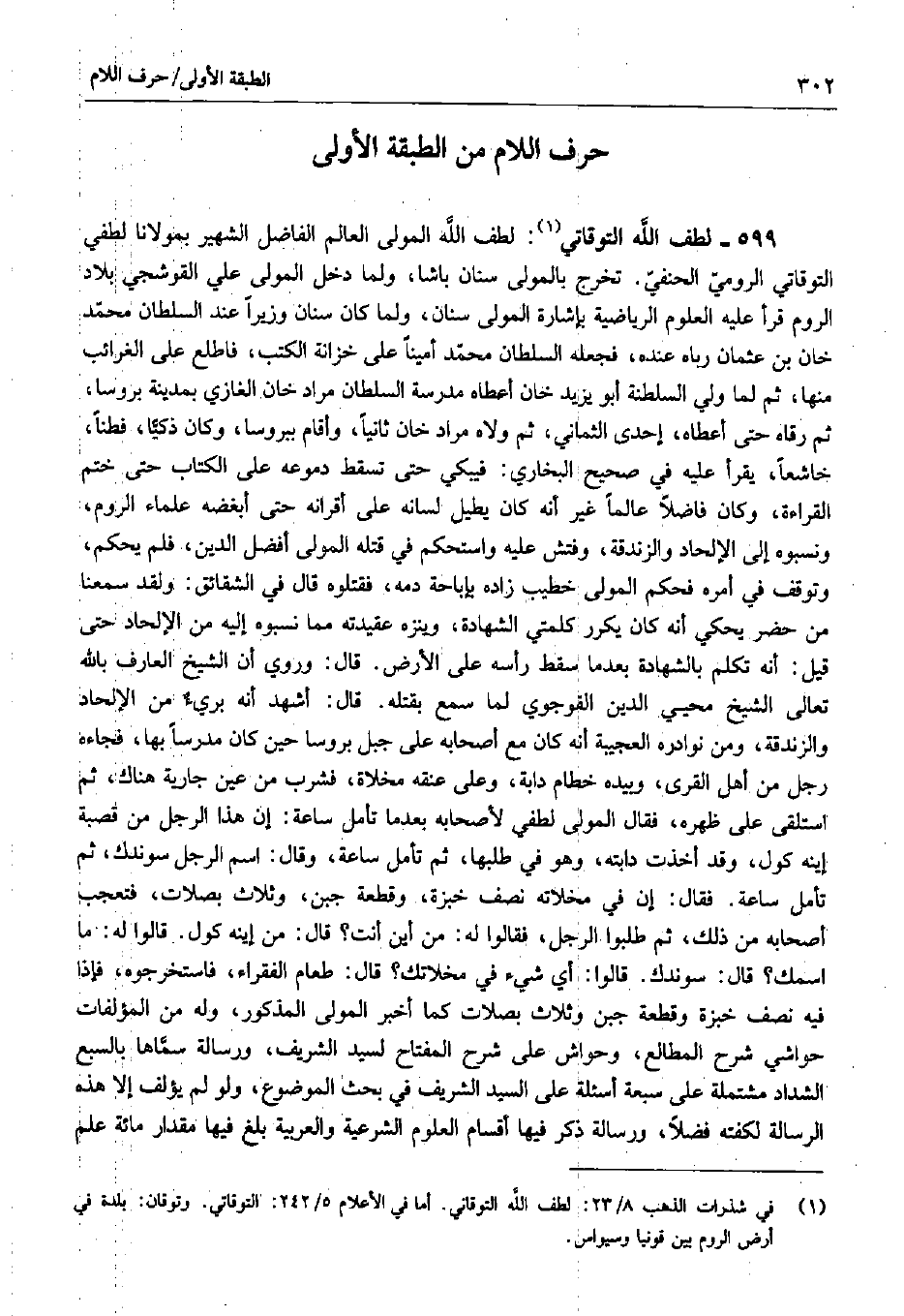 599 - لطف الله التوقاتي: لطف الله المولى العالم الفاضل الشهير بمولانا لطفي التوقاتي الرومي الحنفي. تخرج بالمولى سنان باشا، ولما دخل المولى علي القوشجي بلاد الروم قرأ عليه العلوم الرياضية بإشارة المولى سنان، ولما كان سنان وزيراً عند السلطان محمد خان بن عثمان رباه عنده، فجعله السلطان محمد أميناً على خزانة الكتب، فاطلع على الغرائب منها، ثم لما ولي السلطنة أبو يزيد خان أعطاه مدرسة السلطان مراد خان الغازي بمدينة بروسا، ثم رقاه حتى أعطاه، إحدى الثماني، ثم ولاه مراد خان ثانياً، وأقام ببروسا، وكان ذكياً، فطناً، خاشعاً، يقرأ عليه في صحيح البخاري: فيبكي حتى تسقط دموعه على الكتاب حتى ختم القراءة، وكان فاضلاً عالماً غير أنه كان يطيل لسانه على أقرانه حتى أبغضه علماء الروم، ونسبوه إلى الإلحاد والزندقة، وفتش عليه واستحكم في قتله المولى أفضل الدين، فلم يحكم، وتوقف في أمره فحكم المولى خطيب زاده بإباحة دمه، فقتلوه قال في الشقائق: ولقد سمعنا من حضر يحكي أنه كان يكرر كلمتي الشهادة، وينزه عقيدته مما نسبوه إليه من الإلحاد حتى قيل: أنه تكلم بالشهادة بعدما سقط رأسه على الأرض. قال: وروي أن الشيخ العارف بالله تعالى الشيخ محيي الدين القوجوي لما سمع بقتله. قال: أشهد أنه بريء من الإلحاد والزندقة، ومن نوادره العجيبة أنه كان مع أصحابه على جبل بروسا حين كان مدرساً بها، فجاءه رجل من أهل القرى، وبيده خطام دابة، وعلى عنقه مخلاة، فشرب من عين جارية هناك، ثم استلقى على ظهره، فقال المولى لطفي لأصحابه بعدما تأمل ساعة: إن هذا الرجل من قصبة إينه كول، وقد أخذت دابته، وهو في طلبها، ثم تأمل ساعة، وقال: اسم الرجل سوندك، ثم تأمل ساعة. فقال: إن في مخلاته نصف خبزة، وقطعة جبن، وثلاث بصلات، فتعجب أصحابه من ذلك، ثم طلبوا الرجل، فقالوا له: من أين أنت؟ قال: من إينه كول. قالوا له:. ما اسمك؟ قال: سوندك. قالوا: أي شيء في مخلاتك. قال: طعام الفقراء، فاستخرجوه، فإذا فيه نصف خبزة وقطعة جبن وثلاث بصلات كما أخبر المولى المذكور، وله من المؤلفات حواشي شرح المطالع، وحواش على شرح المفتاح لسيد الشريف، ورسالة سماها بالسبع الشداد مشتملة على سبعة أسئلة على السيد الشريف في بحث الموضوع، ولو لم يؤلف إلا هذه الرسالة لكفته فضلاً، ورسالة ذكر فيها أقسام العلوم الشرعية والعربية بلغ فيها مقدار مائة علم