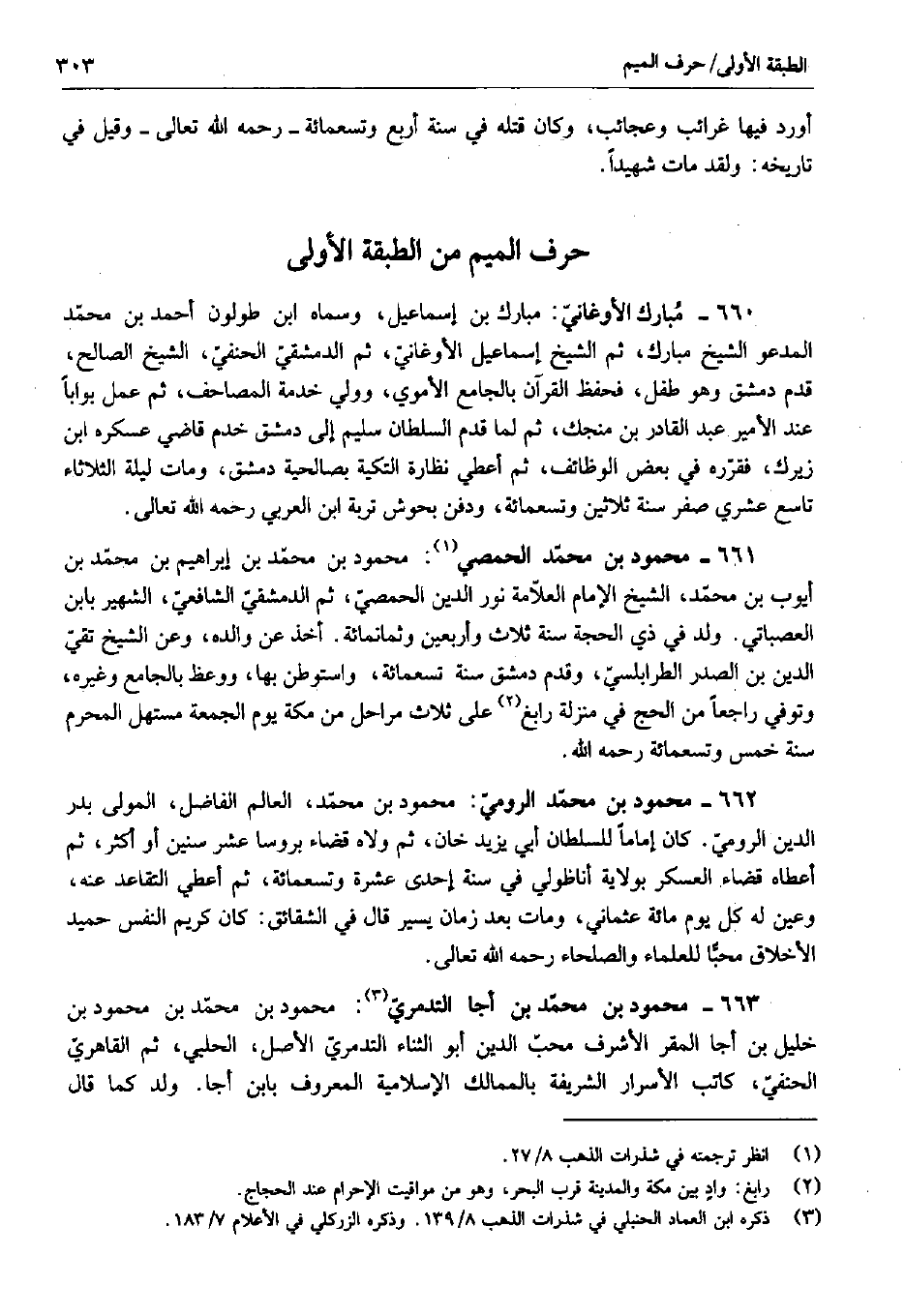 661 - محمود بن محمد الحمصي: محمود بن محمد بن إبراهيم بن محمد بن أيوب بن محمد، الشيخ الإمام العلامة نور الدين الحمصي، ثم الدمشقي الشافعي، الشهير بابن العصباتي. ولد في ذي الحجة سنة ثلاث وأربعين وثمانمائة. أخذ عن والده، وعن الشيخ تقي الدين بن الصدر الطرابلسي، وقدم دمشق سنة تسعمائة، واستوطن بها، ووعظ بالجامع وغيره. وتوفي راجعاً من الحج في منزلة رابغ على ثلاث مراحل من مكة يوم الجمعة مستهل المحرم سنة خمس وتسعمائة رحمه الله.