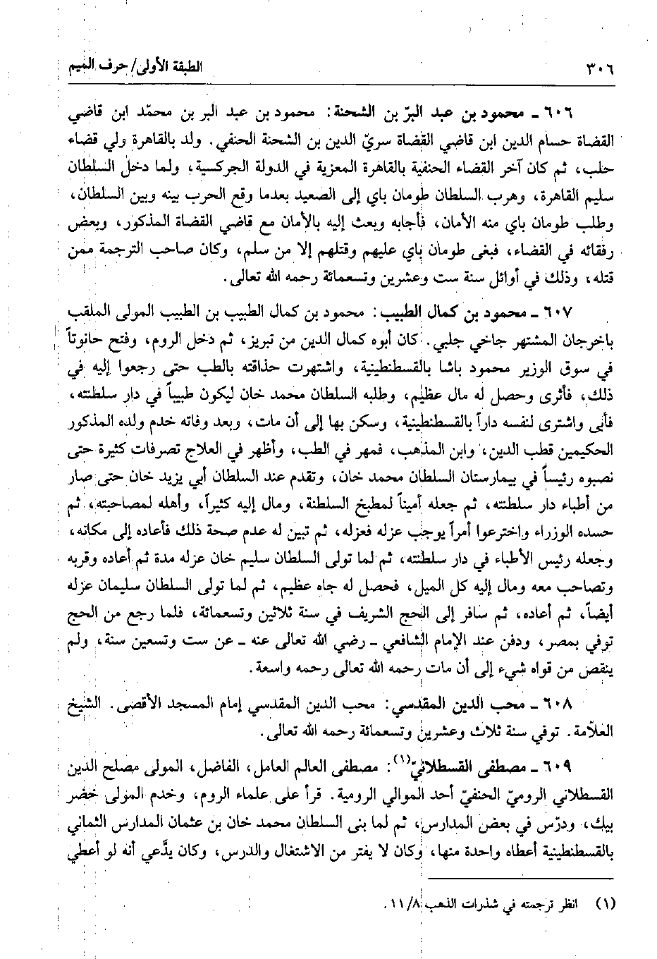 606 - محمود بن عبد البزبن الشحنة: محمودبن عبد البر بن محمد ابن قاضي القضاة حسام الدين ابن قاضي القضاة سري الدين بن الشحنة الحنفي. ولد بالقاهرة ولي قضاء حلب، ثم كان آخر القضاء الحنفية بالقاهرة المعزية في الدولة الجركسية، ولما دخل السلطان سليم القاهرة، وهرب السلطان طومان باي إلى الصعيد بعدما وقع الحرب بينه وبين السلطان، وطلب طومان باي منه الأمان، فأجابه وبعث إليه بالأمان مع قاضي القضاة المذكور، وبعض رفقائه في القضاء، فبغى طومان باي عليهم وقتلهم إلا من سلم، وكان صاحب الترجمة ممن قتله، وذلك في أوائل سنة ست وعشرين وتسعمائة رحمه الله تعالى.
