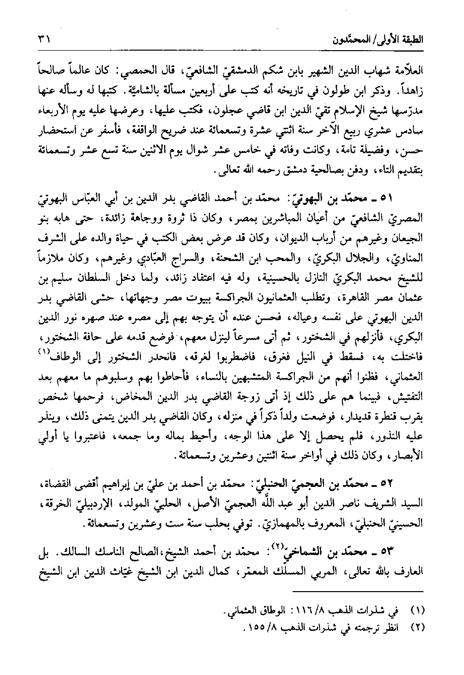 52 - محمد بن العجمي الحنبلي: محمد بن أحمد بن علي بن إبراهيم أقضى القضاة، السيد الشريف ناصر الدين أبو عبد الله العجمي الأصل، الحلبي المولد، الإردبيلي الخرقة الحسيني الحنبلي، المعروف بالمهمازي. توفي بحلب سنة ست وعشرين وتسعمائة.