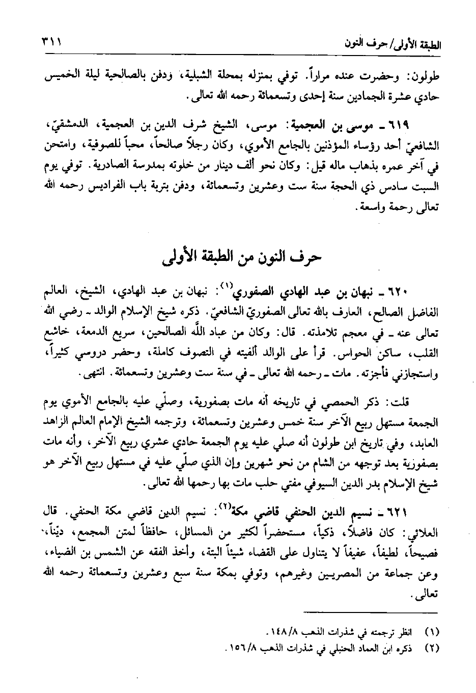 من الطبقة الأولى: 620 - نبهان بن عبد الهادي الصفوري: نبهان بن عبد الهادي، الشيخ، العالم الفاضل الصالح، العارف بالله تعالى الصفورفي الشافعي. ذكره شيخ الإسلام الوالد - رضي الله تعالى عنه - في معجم تلامذته. قال: وكان من عباد الله الصالحين، سريع الدمعة، خاشع القلب، ساكن الحواس. قرأ على الوالد ألفيته في التصوف كاملة، وحضر دروسي كثيراً، واستجازني فأجزته. مات - رحمه الله تعالى - في سنة ست وعشرين وتسعمائة. انتهى.