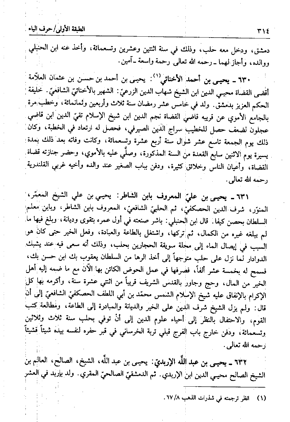 631 - يحيى بن علي المعروف بابن الشاطر: يحيي بن علي الشيخ المعمر، المنور، شرف الدين الحصكفي، ثم الحلبي الشافعي، المعروف بابن الشاطر، وبابن معلم سلطان بحصن كيفا. قال ابن الحنبلي: باشر صنعته في أول عمره بتقوى وديانة، ويلغ فيها ما لم يبلغه غيره من الكمال، ثم تركها، واشتغل بالطاعة والعبادة، وفعل الخير حتى كان هو السبب في إيصال الماء إلى محلة سويقة الحجارين بحلب، وذلك أنه سعى فيه عند يشبك الدوادار لما نزل على حلب متوجهاً إلى أخذ الرها من السلطان يعقوب بك ابن حسن بك، سمح له بخمسة عشر ألفاً، فصرفها في عمل الحوض الكائن بها الآن مع ما ضمه إليه أهل الخير من المال، وحج وجاور بالقدس الشريف قريباً من اثنتي عشرة سنة، وأكرمه بها كل الإكرام بالإنفاق عليه شيخ الإسلام الشمس محمد بن أبي اللطف الحصكفي الشافعي إلى أن قال: ولم يزل الشيخ شرف الدين على الخير والديانة والمبادرة إلى الطاعة، ومطالعة كتب القوم، والاحتفال بالنظر إلى أحياء علوم الدين إلى أن توفي بحلب سنة ثلاث وثلاثين وتسعمائة، ودفن خارج باب الفرج قبلي تربة الخرساني في قبر حفره لنفسه بيده شيئاً فشيئاً رحمه الله تعالى.
