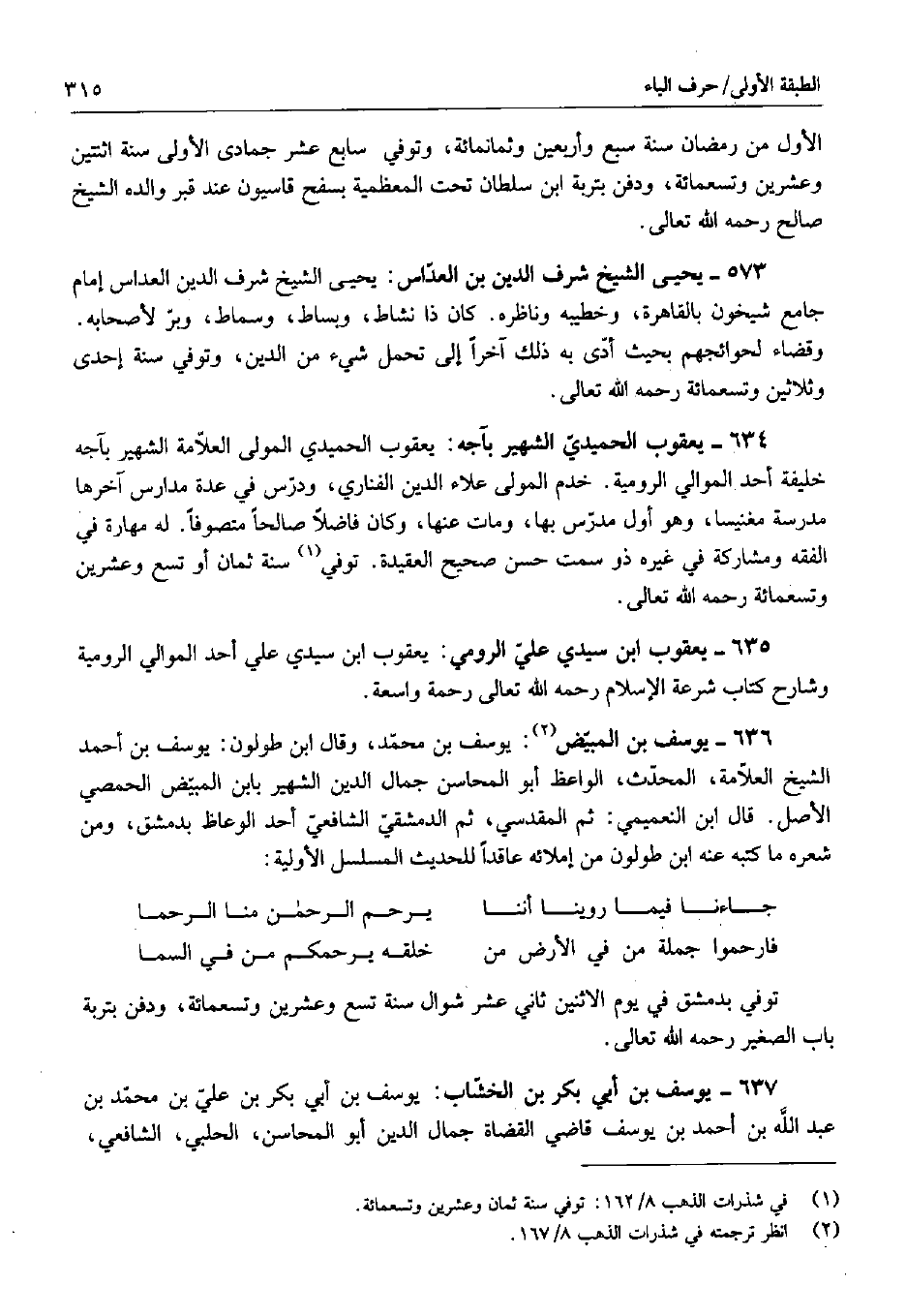 533 - يحيى الشيخ شرف الدين بن العداس: يحيى الشيخ شرف الدين العداس إمام جامع شيخون بالقاهرة، وخطيبه وناظره. كان ذا نشاط، وبساط، وسماط، وبر لأصحابه. وقضاء لحوائجهم بحيث أدى به ذلك آخراً إلى تحمل شيء من الدين، وتوفي سنة إحدى وثلاثين وتسعمائة رحمه الله تعالى.