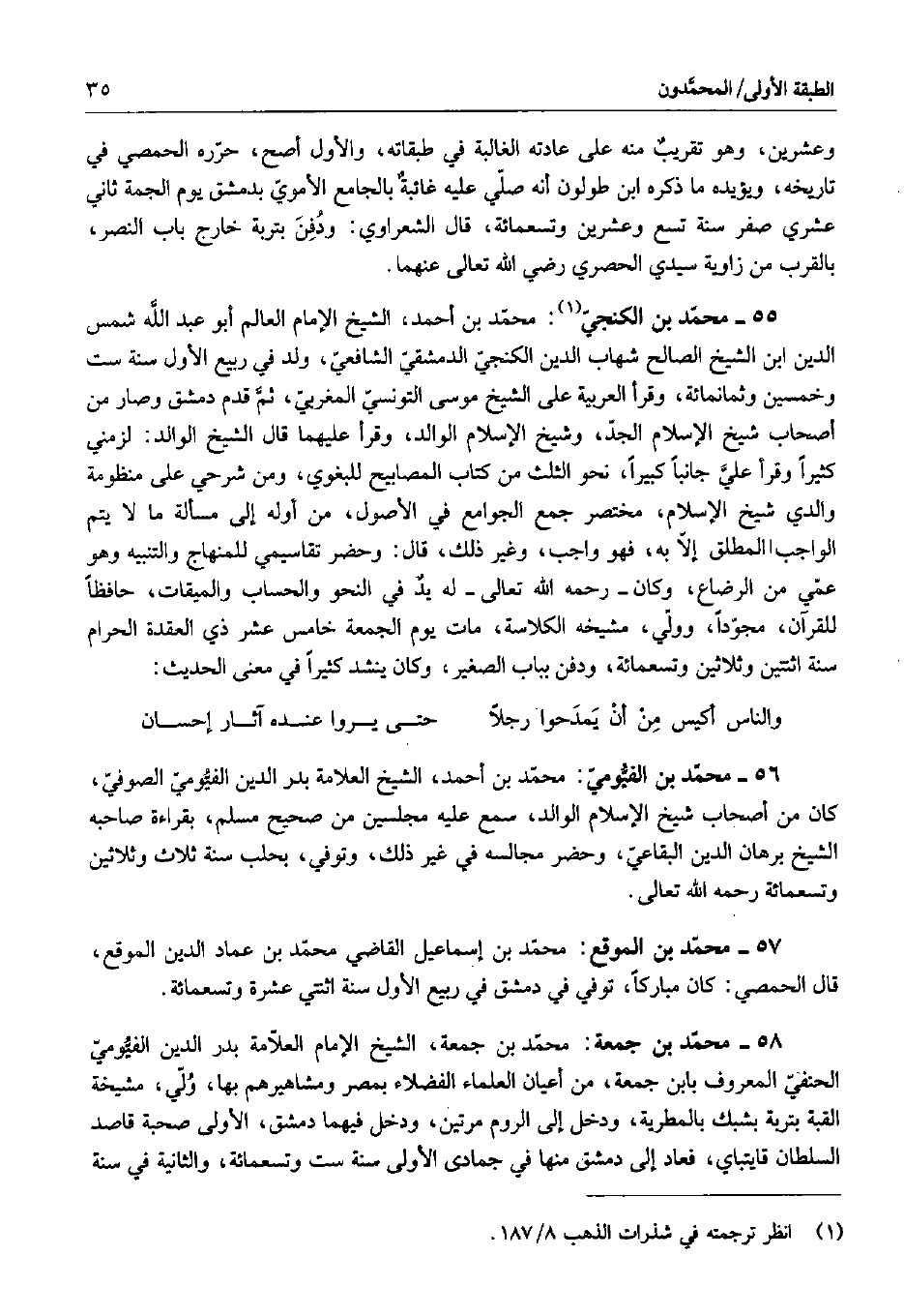 58 - محمد بن جمعة: محمد بن جمعة، الشيخ الإمام العلامة بدر الدين الفيومي الحنفي المعروف بابن جمعة، من أعيان العلماء الفضلاء بمصر ومشاهيرهم بها، ولي، مشيخة القبة بتربة بشبك بالمطرية، ودخل إلى الروم مرتين، ودخل فيهما دمشق، الأولى صحبة قاصد السلطان قايتباي، فعاد إلى دمشق منها في جمادى الأولى سنة ست وتسعمائة، والثانية في سنة