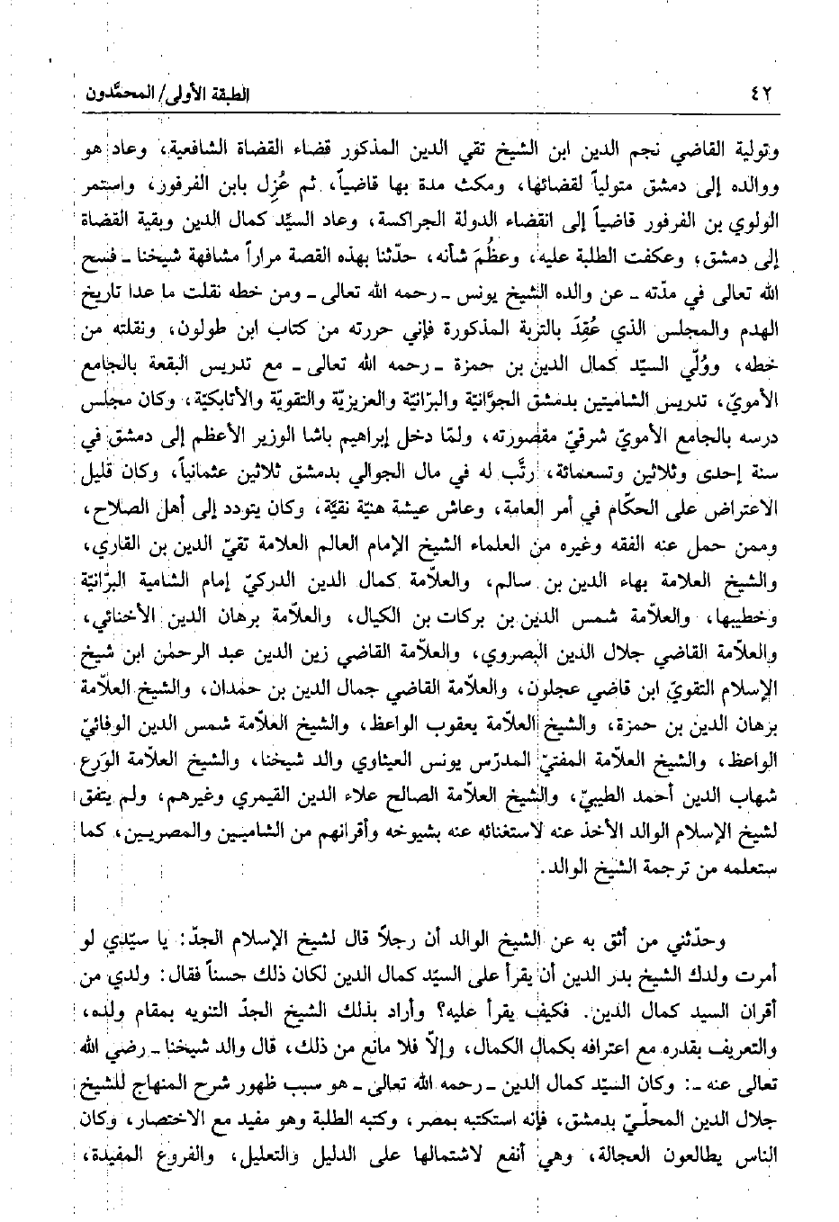 وحئثني من أثق به عن الشيخ الوالد أن رجلاً قال لشيخ الإسلام الجد: يا سيدي لو أمرت ولدك الشيخ بدر الدين أن يقرأ على السيد كمال الدين لكان ذلك حسناً فقال: ولدي من أقران السيد كمال الدين. فكيف يقرأ عليه؟ وأراد بذلك الشيخ الجد التنويه بمقام ولده، والتعريف بقدره مع اعترافه بكمال الكمال، وإلا فلا مانع من ذلك، قال والد شيخنا - رضي الله تعالى عنه -: وكان السيد كمال الدين - رحمه الله تعالى - هو سبب ظهور شرح المنهاج للشيخ جلال الدين المحلي بدمشق، فإنه استكتبه بمصر، وكتبه الطلبة وهو مفيد مع الاختصار، وكان الناس يطالعون العجالة، وهي أنفع لاشتمالها على الدليل والتعليل، والفروع المفيدة،
