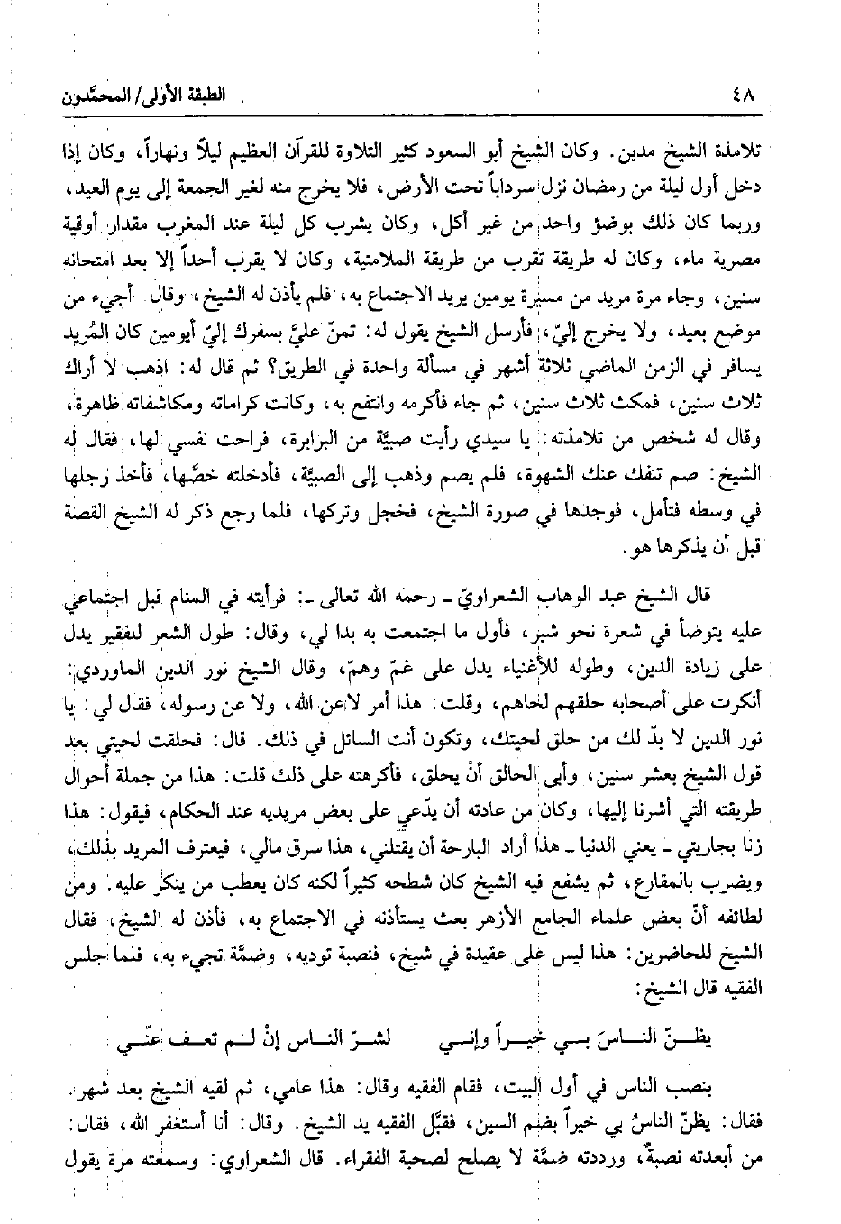 بنصب الناس في أول البيت، فقام الفقيه وقال: هذا عامي، ثم لقيه الشيخ بعد شهر. فقال: يظن الناس بي خيراً بضم السين، فقبل الفقيه يد الشيخ. وقال: أنا أستغفر الله، فقال: من أبعدته نصبة، ورددته ضمة لا يصلح لصحبة الفقراء. قال الشعراوي: وسمعته مرة يقول