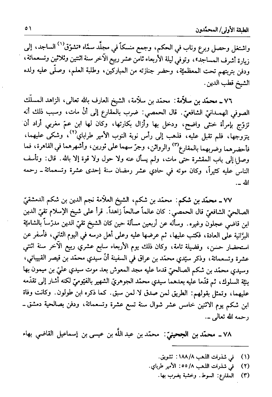 77 - محمد بن شكم: محمد بن شكم، الشيخ العلامة نجم الدين بن شكم الدمشقي الصالحي الشافعي قال الحمصي: كان عالماً صالحاً زاهداً. قرأ على شيخ الإسلام تقي الدين ابن قاضي عجلون وغيره. وسأله عن أربعين مسألة حين كان الشيخ تقي الدين مدرساً بالشامية البرانية على العادة، فكتب عليها، ثم عرضها عليه وعلى أهل درسه في اليوم الثاني، فأسفر عن استحضار حسن، وفضيلة تامة، وكان ذلك يوم الأربعاء سابع عشري ربيع الآخر سنة اثنتي عشرة وتسعمائة، وذكر سيدي محمد بن عراق في السفينة أن سيدي محمد بن قيصر القبيباتي، وسيدي محمد بن شكم الصالحي قدما عليه مجد المعوش بعد موت سيدي علي بن ميمون بها بنية السلوك، ثم قدما عليه بعدهما سيدي محمد الجوهرفي الشهير بالفيومي لكنه أشار إلى تقدمه عليهما، وتمثل بقولهم: الطريق لمن صدق لا لمن سبق. كما ذكره ابن طولون. وكانت وفاة ابن شكم يوم الاثنين خامس عشر شوال سنة تسع عشرة وتسعمائة، ودفن بصالحية دمشق - رحمه الله تعالى -.