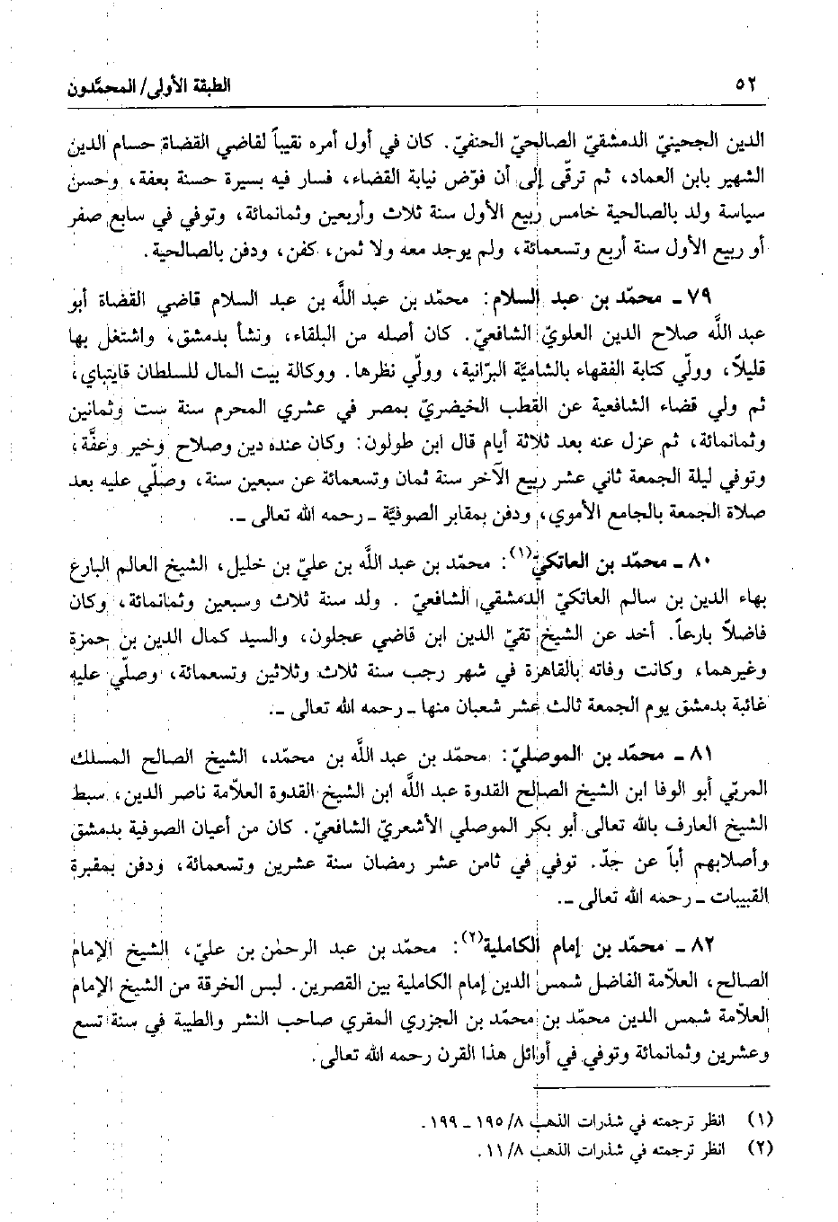 79 - محمد بن عبد السلام: محمد بن عبد الله بن عبد السلام قاضي القضاة أبو عبد الله صلاح الدين العلوي الشافعي. كان أصله من البلقاء، ونشأ بدمشق، واشتغل بها قليلاً، وولي كتابة الفقهاء بالشامية البرانية، وولي نظرها. ووكالة بيت المال للسلطان قايتباي، ثم ولي قضاء الشافعية عن القطب الخيضري بمصر في عشري المحرم سنة ست وثمانين وثمانمائة، ثم عزل عنه بعد ثلاثة أيام قال ابن طولون: وكان عنده دين وصلاح وخير وعفة، وتوفي ليلة الجمعة ثاني عشر ربيع الآخر سنة ثمان وتسعمائة عن سبعين سنة، وصلي عليه بعد صلاة الجمعة بالجامع الأموي، ودفن بمقابر الصوفية - رحمه الله تعالى -.