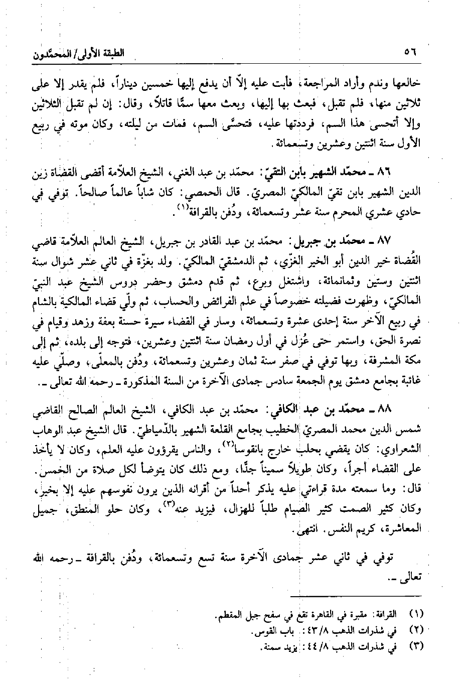 86 - محمد الشهير بابن التقي: محمد بن عبد الغني، الشيخ العلامة أقضى القضاة زين الدين الشهير بابن تقي المالكي المصري. قال الحمصي: كان شاباً عالماً صالحاً. توفي في حادي عشري المحرم سنة عشر وتسعمائة، ودفن بالقرافة.
