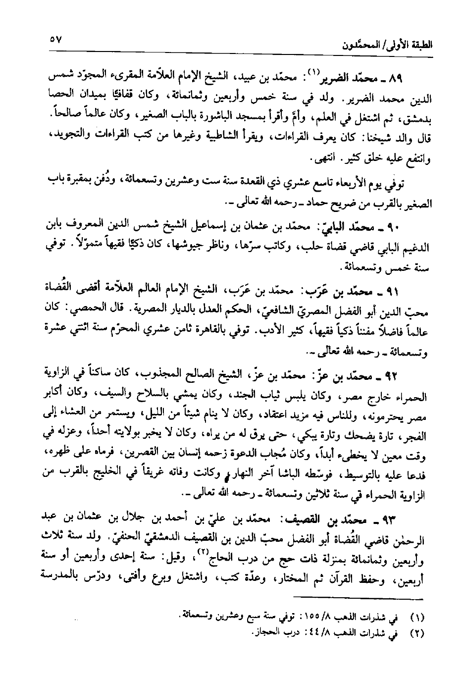 92 - محمد بن عز: محمد بن عز، الشيخ الصالح المجذوب، كان ساكناً في الزاوية الحمراء خارج مصر، وكان يلبس ثياب الجند، وكان يمشي بالسلاح والسيف، وكان أكابر مصر يحترمونه، وللناس فيه مزيد اعتقاد، وكان لا ينام شيئاً من الليل، ويستمر من العشاء إلى الفجر، تارة يضحك وتارة يبكي، حتى يرق له من يراه، وكان لا يخبر بولايته أحداً، وعزله في وقت معين لا يخطئ أبداً، وكان مجاب الدعوة زحمه إنسان بين القصرين، فرماه على ظهره، فدعا عليه بالتوسيط، فوسطه الباشا آخر النهار، وكانت وفاته غريقاً في الخليج بالقرب من الزاوية الحمراء في سنة ثلاثين وتسعمائة - رحمه الله تعالى - 93 - محمد بن القصيف: محمد بن علي بن أحمد بن جلال بن عثمان بن عبد الرحمن قاضي القضاة أبو الفضل محب الدين بن القصيف الدمشقي الحنفي. ولد سنة ثلاث وأربعين وثمانمائة بمنزلة ذات حج من درب الحاج، وقيل: سنة إحدى وأربعين أو سنة أربعين، وحفظ القرآن ثم المختار، وعدة كتب، واشتغل وبرع وأفتى، ودرس بالمدرسة