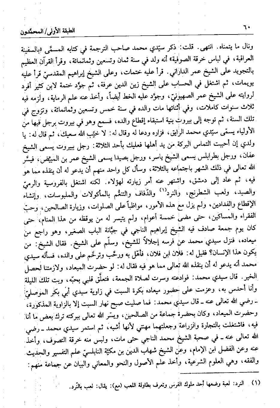 ونال ما يتمناه. انتهى. قلت: ذكر سيدي محمد صاحب الترجمة في كتابه المسمى " بالسفينة العراقية، في لباس خرقة الصوفية " أنه ولد في سنة ثمان وتسعين وثمانمائة، وقرأ القرآن العظيم بالتجويد على الشيخ عمر الداراني. قرأ عليه ختمات، وعلى الشيخ إبراهيم المقدسي قرأ عليه يويمات، ثم اشتغل في الحساب على الشيخ زين الدين عرفة، ثم جود ختمة لابن كثير أفرد لروايته على الشيخ عمر الصهيوني، وجود عليه الخط أيضاً، وأخذ عنه علم الرماية، ولزمه فيه ثلاث سنوات كاملات، وفي أثنائها مات والده في سنة خمس وتسعين وثمانمائة، وتزوج في تلك السنة، ثم توجه إلى بيروت بنية استبقاء إقطاع والده، فسمع وهو في بيروت برجل فيها من الأولياء يسمى سيدي محمد الرايق، فزاره ودعا له وقال له: لا خيب الله سعيك، ثم قال له: يا ولدي إن أحببت التماس البركة من يد أهلها فعليك بأحد الثلاثة: رجل ببيروت يسمى الشيخ عفان، ورجل بطرابلس يسمى الشيخ ياسر، ورجل بصيدا يسمى الشيخ عمر بن المبيض، فيسر الله تعالى في ذلك الشهر باجتماعه بالثلاثة، وسأل كل واحد منهم أن يدعو له أن ينقذه مما هو فيه، ثم عاد إلى دمشق، واشتهر عنه أمر زيارته لهؤلاء. لكنه اشتغل بالفروسية والرمي والصيد، ولعب الشطرنج، والنرد والدفاف والتنعم بالمأكولات والملبوسات، وإنشاء الإقطاع والفدادين، ولم يزل مع هذه الأمور، مواظباً على الصلوات، وزيارة الصالدين، وحب الفقراء والمساكين، حتى مضى خمسة أعوام، ولم يتيسر له من يوقظه من هذا المنام، حتى كان يوم جمعة صادف فيه الشيخ إبراهيم الناجي في جبانة الباب الصغير، وهو راجع من ميعاده، فنزل سيدي محمد عن فرسه إجلالاً للشيخ وسلم على الشيخ. فقال الشيخ: من يكون هذا الإنسان؟ فقيل له: فلان ابن فلان، فأهل به ورحب وترحم على والده، فسأله سيدي محمد أنه يدعو له أن ينقذه الله تعالى مما هو فيه فقال له: لو حضرت الميعاد، ولازمتنا لحصل خير. قال سيدي محمد: فوادعته وسرت لصلاة الجمعة، فتعلق قلبي بحبه، وبت تلك الليلة وأنا أحدس به، وعزمت على حضور ميعاده بكرة السبت في زاوية سيدي أبي بكر الموصلي - رضي الله تعالى عنه - قال سيدي محمد: فما صليت صبح نهار السبت إلا بالزاوية المذكورة، وحضرت الميعاد، وكان بحضرة جماعة من الصالدين، ويسر الله تعالى ببركته ترك بعض ما أنا فيه فاشتغلت بالتجارة والزراعة وجعلتهما مهنتي لأنها أشبه، ثم استمر سيدي محمد - رضي الله تعالى عنه - في صحبة الشيخ محمد الناجي حتى مات، ولبس منه خرقة التصوف، وأخذ عنه وعن الفضل ابن الإمام، وعن الشيخ شهاب الدين بن مكية النابلسي علم التفسير والحديث والفقه، وهي العلوم الشرعية، وأخذ علم الأصول والنحو والمعاني والبيان عن جماعة منهم:
