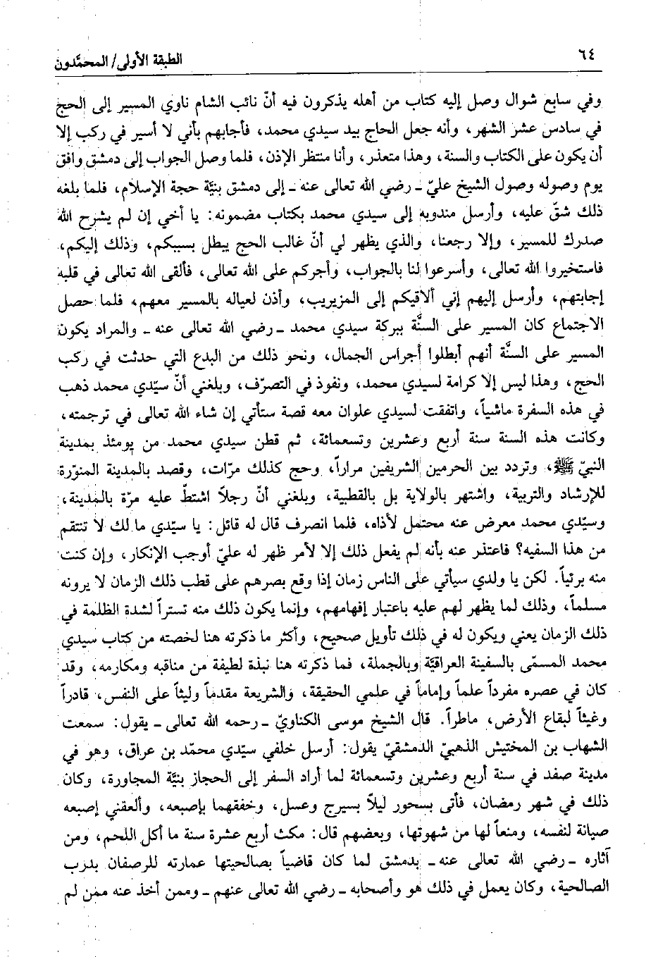 وفي سابع شوال وصل إليه كتاب من أهله يذكرون فيه أن نائب الشام ناوي المسير إلى الحج في سادس عشر الشهر، وأنه جعل الحاج بيد سيدي محمد، فأجابهم بأني لا أسير في ركب إلا أن يكون على الكتاب والسنة، وهذا متعذر، وأنا منتظر الإذن، فلما وصل الجواب إلى دمشق وافق يوم وصوله وصول الشيخ علي - رضي الله تعالى عنه - إلى دمشق بنية حجة الإسلام، فلما بلغه ذلك شق عليه، وأرسل مندوبه إلى سيدي محمد بكتاب مضمونه: ياأخي إن لم يشرح الله صدرك للمسير، وإلا رجعنا، والذي يظهر لي أن غالب الحج يبطل بسببكم، وذلك إليكم، فاستخيروا الله تعالى، وأسرعوا لنا بالجواب، وأجركم على الله تعالى، فالقى الله تعالى في قلبه إجابتهم، وأرسل إليهم إني ألاقيكم إلى المزيريب، وأذن لعياله بالمسير معهم، فلما حصل الاجتماع كان المسير على السنة ببركة سيدي محمد - رضي الله تعالى عنه - والمراد يكون المسير على السنة أنهم أبطلوا أجراس الجمال، ونحو ذلك من البدع التي حدثت في ركب الحج، وهذا ليس إلا كرامة لسيدي محمد، ونفوذ في التصرف، وبلغني أن سيدي محمد ذهب في هذه السفرة ماشياً، واتفقت لسيدي علوان معه قصة ستأتي إن شاء الله تعالى في ترجمته، وكانت هذه السنة سنة أربع وعشرين وتسعمائة، ثم قطن سيدي محمد من يومئذ بمدينة النبي صلى الله عليه وسلم، وتردد بين الحرمين الشريفين مراراً، وحج كذلك مرات، وقصد بالمدينة المنورة للإرشاد والتريية، واشتهر بالولاية بل بالقطبية، وبلغني أن رجلاً اشتط عليه مرة بالمدينة، وسيدي محمد معرض عنه محتمل لأذاه، فلما انصرف قال له قائل: يا سيدي ما لك لا تنتقم من هذا السفيه؟ فاعتذر عنه بأنه لم يفعل ذلك إلا لأمر ظهر له علي أوجب الإنكار، وإن كنت منه برئياً. لكن يا ولدي سيأتي على الناس زمان إذا وقع بصرهم على قطب ذلك الزمان لا يرونه مسلماً، وذلك لما يظهر لهم عليه باعتبار إفهامهم، وإنما يكون ذلك منه تستراً لشدة الظلمة في ذلك الزمان يعني ويكون له في ذلك تأويل صحيح، وأكثر ما ذكرته هذا لخصته من كتاب سيدي محمد المسمى بالسفينة العراقية وبالجملة، فما ذكرته