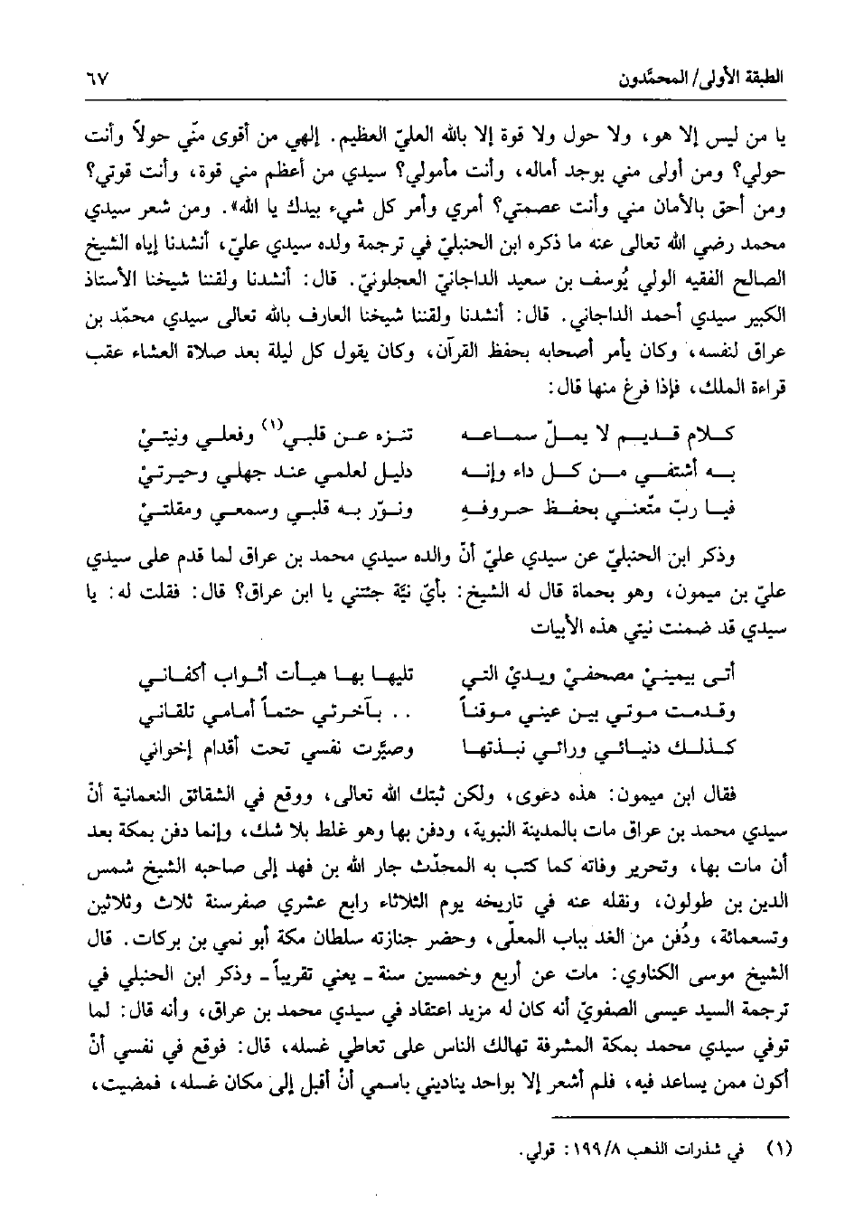 يا من ليس إلا هو، ولا حول ولا قوة إلا بالله العلي العظيم. إلهي من أقوى متي حولاً وأنت حولي؟ ومن أولى مني بوجد أماله، وأنت مأمولي. سيدي من أعظم مني قوة، وأنت قوتي؟ ومن أحق بالأمان مني وأنت عصمتي؟ أمري وأمر كل شيء بيدك يا الله ". ومن شعر سيدي محمد رضي الله تعالى عنه ما ذكره ابن الحنبلي في ترجمة ولده سيدي علي، أنشدنا إياه الشيخ الصالح الفقيه الولي يوسف بن سعيد الداجاني العجلوني. قال: أنشدنا ولقننا شيخنا الأستاذ الكبير سيدي أحمد الداجاني. قال: أنشدنا ولقننا شيخنا العارف بالله تعالى سيدي محمد بن عراق لنفسه، وكان يأمر أصحابه بحفظ القرآن، وكان يقول كل ليلة بعد صلاة العشاء عقب قراءة الملك، فإذا فرغ منها قال: