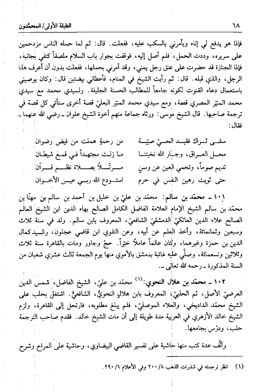 102 - محمد بن هلال النحوي: محمد بن علي، الشيخ الفاضل، شمس الدين العرضي الأصل، ثم الحلبي، المعروف بابن هلال النحوي، الشافعي. اشتغل بحلب على الشيخ محمد الداديخي، والعلاء الموصلي، فلم يبلغ مطلوبه، فارتحل إلى القاهرة، ولزم الشيخ خالد الأزهري في العربية مدة طويلة إلى أن مات الشيخ خالد. فقدم صاحب الترجمة حلب، ودرس بجامعها.