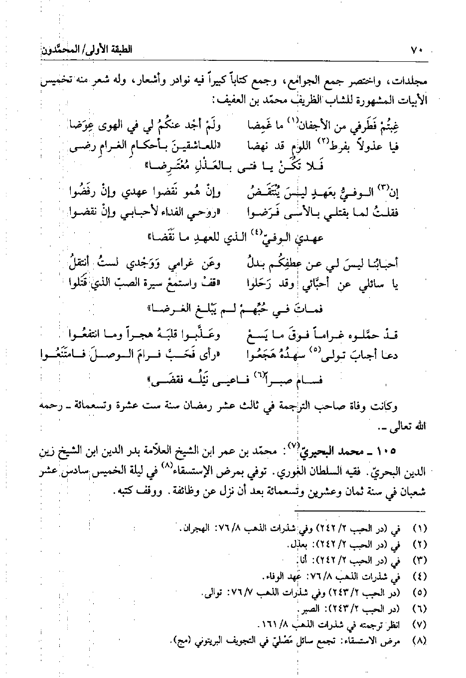 105 - محمد البحيري: محمد بن عمر ابن الشيخ العلامة بدر الدين ابن الشيخ زين الدين البحرفي. فقيه السلطان الغوري. توفي بمرض الإستسقاء في ليلة الخميس سادس عشر شعبان في سنة ثمان وعشرين وتسعمائة بعد أن نزل عن وظائفة. ووقف كتبه.