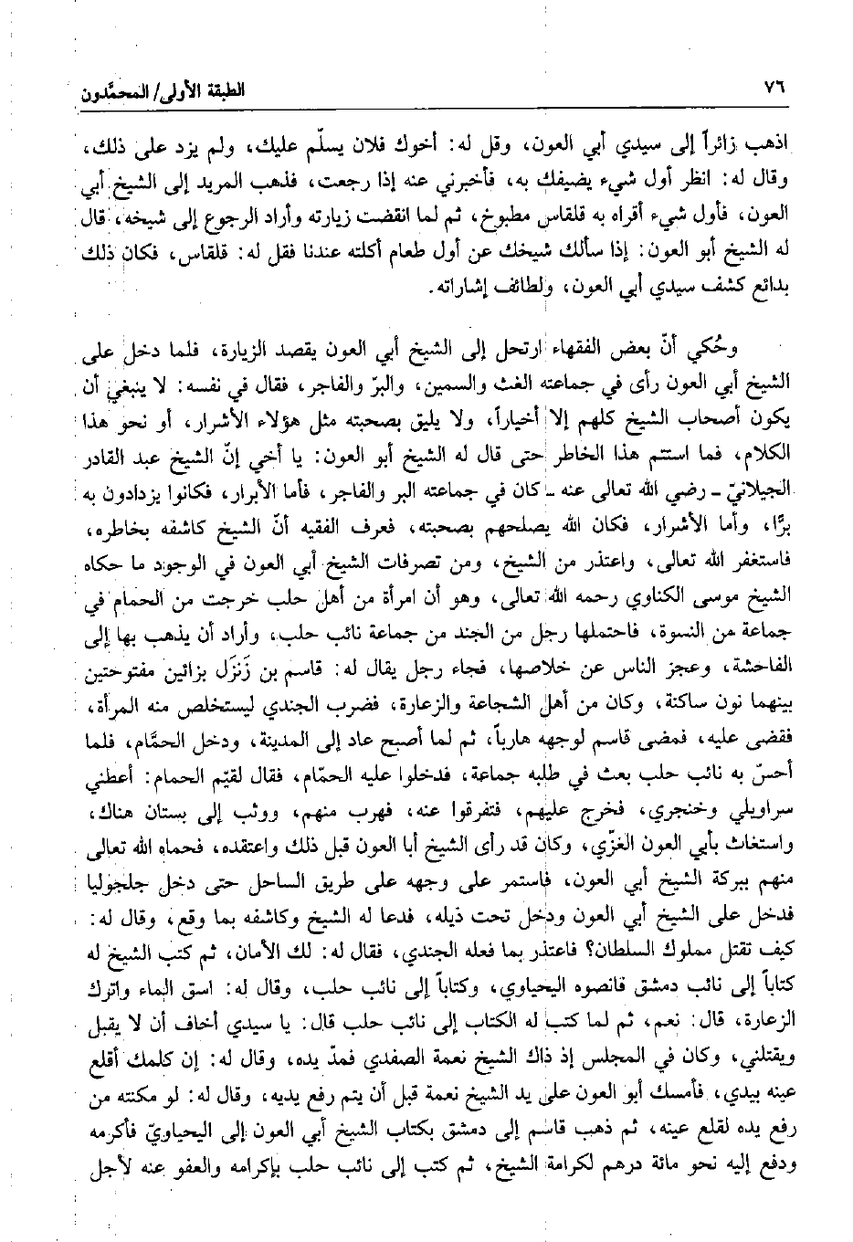 وحكي أن بعض الفقهاء ارتحل إلى الشيخ أبي العون يقصد الزيارة، فلما دخل على الشيخ أبي العون رأى ي جماعته الغث والسمين، والبر والفاجر، فقال في نفسه: لا ينبغي أن يكون أصحاب الشيخ كلهم إلا أخياراً، ولا يليق بصحبته مثل هؤلاء الأشرار، أو نحو هذا الكلام، فما استتم هذا الخاطر حتى قال له الشيخ أبو العون: يا أخي إن الشيخ عبد القادر الجيلاني - رضي الله تعالى عنه - كان في جماعته البر والفاجر، فأما الأبرار، فكانوا يزدادون به براً، وأما الأشرار، فكان الله يصلحهم بصحبته، فعرف الفقيه أن الشيخ كاشفه بخاطره، فاستغفر الله تعالى، واعتذر من الشيخ، ومن تصرفات الشيخ أبي العون في الوجود ما حكاه الشيخ موسى الكناوي رحمه الله تعالى، وهو أن امرأة من أهل حلب خرجت من الحمام في جماعة من النسوة، فاحتملها رجل من الجند من جماعة نائب حلب، وأراد أن يذهب بها إلى الفاحشة، وعجز الناس عن خلاصها، فجاء رجل يقال له: قاسم بن زنزل بزائين مفتوحتين بينهما نون ساكنة، وكان من أهل الشجاعة والزعارة، فضرب الجندي ليستخلص منه المرأة، فقضى عليه، فمضى قاسم لوجهه هارباً، ثم لما أصبح عاد إلى المدينة، ودخل الحمام، فلما أحس به نائب حلب بعث في طلبه جماعة، فدخلوا عليه الحمام، فقال لقيم الحمام: أعطني سراويلي وخنجري، فخرج عليهم، فتفرقوا عنه، فهرب منهم، ووثب إلى بستان هناك، واستغاث بأبي العون الغزي، وكان قد رأى الشيخ أبا العون قبل ذلك واعتقده، فحماه الله تعالى منهم ببركة الشيخ أبي العون، فاستمر على وجهه على طريق الساحل حتى دخل جلجوليا فدخل على الشيخ أبي العون ودخل تحت ذيله، فدعا له الشيخ وكاشفه بما وقع، وقال له: كيف تقتل مملوك السلطان؟ فاعتذر بما فعله الجندي، فقال له: لك الأمان، ثم كتب الشيخ له كتاباً إلى نائب دمشق قانصوه اليحياوي، وكتاباً إلى نائب حلب، وقال له: اسق الماء واترك الزعارة، قال: نعم، ثم لما كتب له الكتاب إلى نائب حلب قال: يا سيدي أخاف أن لا يقبل ويقتلني، وكان في المجلس إذ ذاك الشيخ نعمة الصفدي فمد يده، وقال له: إن كلمك أقلع عينه بيدي، فأمسك أبو العون على يد الشيخ نعمة قبل أن يتم رفع يديه، وقال له: لو مكنته من رفع يده لقلع عينه، ثم ذهب قاسم إلى دمشق بكتاب الشيخ أبي العون إلى اليحياوي فأكرمه ودفع إليه نحو مائة درهم لكرامة الشيخ، ثم كتب إلى نانب حلب بإكرامه والعفو عنه لأجل