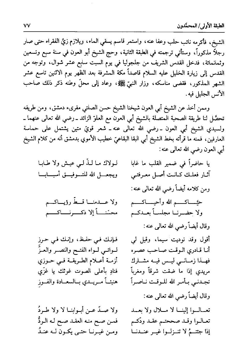 وممن أخذ عن الشيخ أبي العون شيخنا الشيخ حسن الصلتي مقرئ دمشق، ومن طريقه تحصل لنا طريقة الصحبة المتصلة بالشيخ أبي العون مع العلو الزائد - رضي الله تعالى عنهما - ولسيدي الشيخ أبي العون - رضي الله تعالى عنه - شعر قوي متين يشتمل على حماسة العارفين، فمنه ما قرأته بخط الشيخ أبي البقا البقاعي خطيب الأموي بدمشق أنه من كلام الشيخ أبي العون رضي الله تعالى عنه: