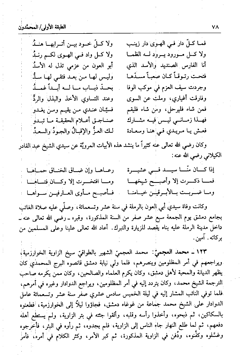 123 - محمد العجمي: محمد العجمي الشهير بالطواقي شيخ الزاوية الخوارزمية، ويراجعهم في أمر المظلومين وينصرهم، فلما ولي نيابة دمشق قانصوه البرج المحمدي كان يظهر الديانة والمحبة لأهل دمشق، وكان يكرم العلماء والصالدين، وكان ممن يكرمه صاحب الترجمة الشيخ محمد، وكان يتردد إليه في أمر المظلومين، ويراجع الدوادار وغيره في أمرهم، فلما توفي النائب المشار إليه في ليلة الخميس سادس عشري صفر سنة عشر وتسعمائة عامل الدوادار على الشيخ محمد جماعة من غوغاء دمشق، فجاؤوا ليلاً إلى الخوارزمية، فطعنوه بالسكاكين، ثم ذبحوه، وأخفوا رأسه وقلبه، وألقوا جثته في بئر الزاوية، ولم يستطع أهله دفعهم، ثم لما طلع النهار جاء الناس إلى الزاوية، فلم يجدوه، ثم رأوه في البئر، فأخرجوه وغسلوه وكفنوه، ودفن في الزاوية المذكورة، ثم كبر الأمر، وكثر الكلام في أمره، فأمر