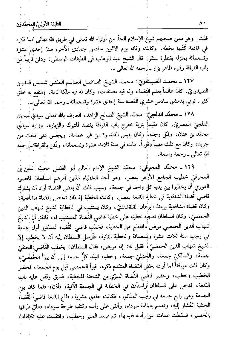 128 - محمد الدلجي: محمد الشيخ الصالح الزاهد، العارف بالله تعالى سيدي محمد الدلجي المصري. كان مقيماً بتربة خارج باب القرافة يقصد للتبرك والزيارة، وزاره سيدي محمد بن عنان، وقبل رجله، وكان يلبس القلنسوة من غير عمامة، ويجلس على تخت من جريد، وكان مع ذلك مهيباً وقوراً. مات في سنة ثلاث عشرة وتسعمائة، ودفن بالقرافة - رحمه الله تعالى - رحمة واسعة.