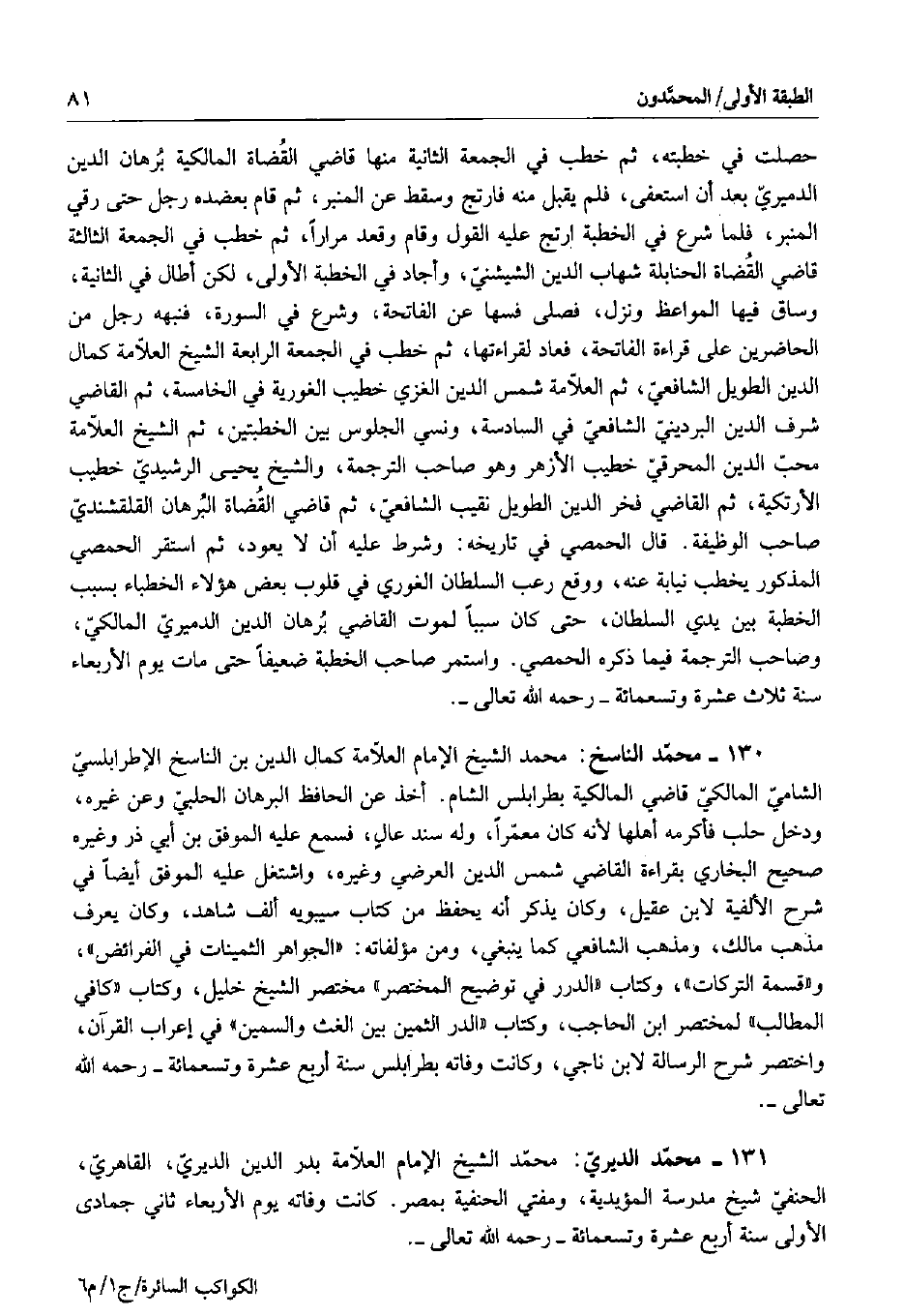130 - محمد الناسخ: محمد الشيخ الإمام العلامة كمال الدين بن الناسخ الإطرابلسي الشامي المالكي قاضي المالكية بطرابلس الشام. أخذ عن الحافظ البرهان الحلبي وعن غيره، ودخل حلب فأكرمه أهلها لأنه كان معمرًا، وله سند عال، فسمع عليه الموفق بن أبي ذر وغيره صحيح البخاري بقراءة القاضي شمس الدين العرضي وغيره، واشتغل عليه الموفق أيضاً في شرح الألفية لابن عقيل، وكان يذكر أنه يحفظ من كتاب سيبويه ألف شاهد، وكان يعرف مذهب مالك، ومذهب الشافعي كما ينبغي، ومن مؤلفاته: " الجواهر الثمينات في الفرائض "، و " قسمة التركات "، وكتاب " الدرر في توضيح المختصر " مختصر الشيخ خليل، وكتاب " كافي المطالب " لمختصر ابن الحاجب، وكتاب " الحر الثمين بين الغث والسمين " في إعراب القرآن، واختصر شرح الرسالة لابن ناجي، وكانت وفاته بطرابلس سنة أربع عشرة وتسعمائة - رحمه الله تعالى -.