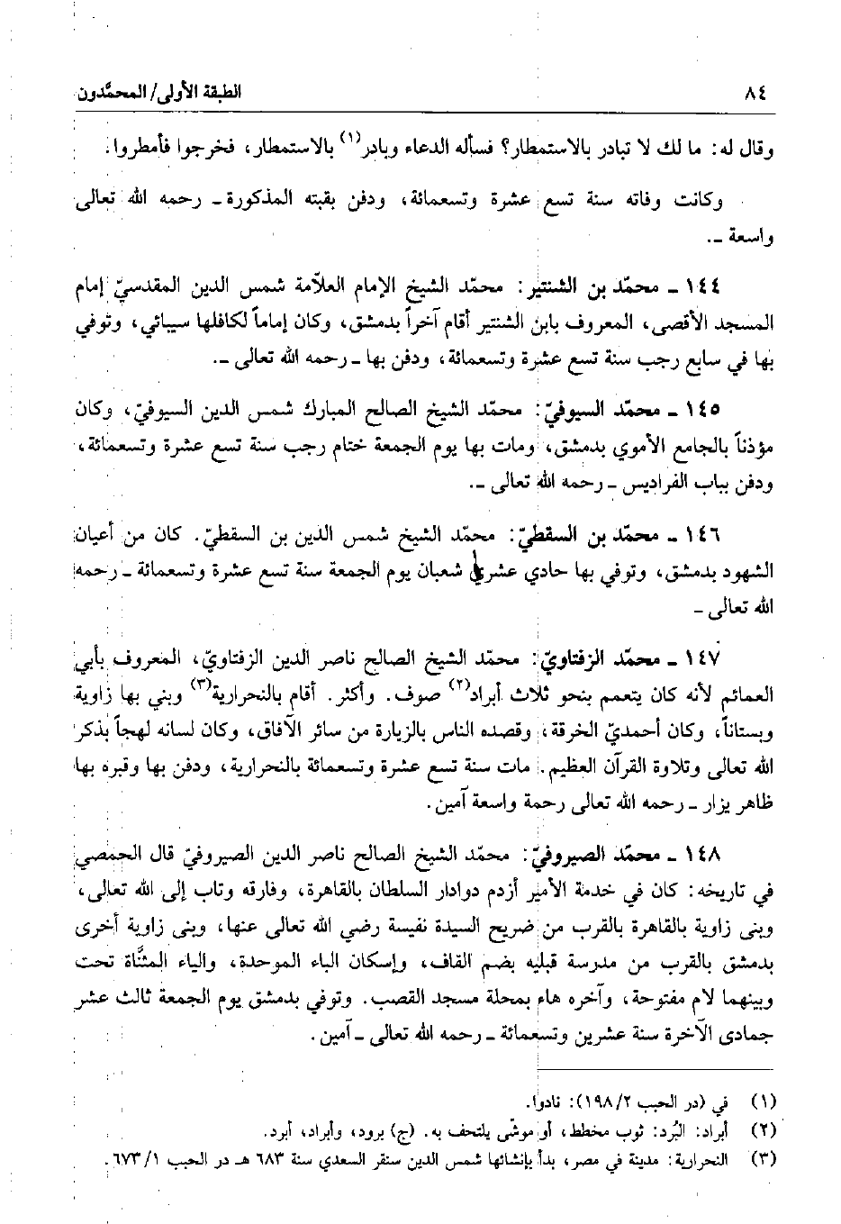 144 - محمد بن الشنتير: محمد الشيخ الإمام العلامة شمس الدين المقدسي إمام المسجد الأقصى، المعروف بابن الشنتير أقام آخراً بدمشق، وكان إماماً لكافلها سيبائي، وتوفي بها في سابع رجب سنة تسع عشرة وتسعمائة، ودفن بها - رحمه الله تعالى -.