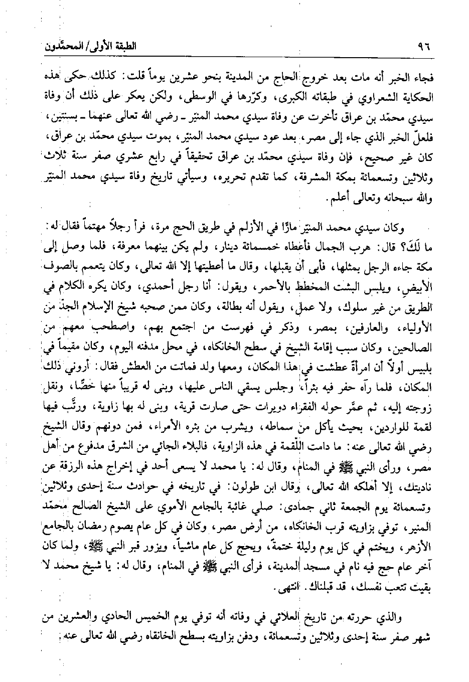 فجاء الخبر انه مات بعد خروج الحاج من المدينة بنحو عشرين يوماً قلت: كذلك حكى هذه الحكاية الشعراوي في طبقاته الكبرى، وكررها في الوسطى، ولكن يعكر على ذلك أن وفاة سيدي محمد بن عراق تأخرت عن وفاة سيدي محمد المنير - رضي الله تعالى عنهما - بسنتين، فلعل الخبر الذي جاء إلى مصر، بعد عود سيدي محمد المنير، بموت سيدي محمد بن عراق، كان غير صحيح، فإن وفاة سيدي محمد بن عراق تحقيقاً في رابم عشري صفر سنة ثلاث وثلاثين وتسعمائة بمكة المشرفة، كما تقدم تحريره، وسيأتي تاريخ وفاة سيدي محمد المنير والله سبحانه وتعالى أعلم.