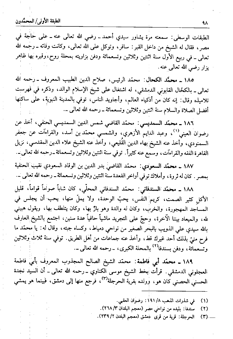 189 - محمد أبي فاطمة: محمد الشيخ الصالح المجذوب المعروف بأبي فاطمة العجلوني الدمشقي. قرأت بخط الشيخ موسى الكناري - رحمه الله تعالى - أن السيد نجدة الحسني الحصني كان هو، وولده بقرية الحرجلة، فرجع منها إلى دمشق، فبينما هو يمشي