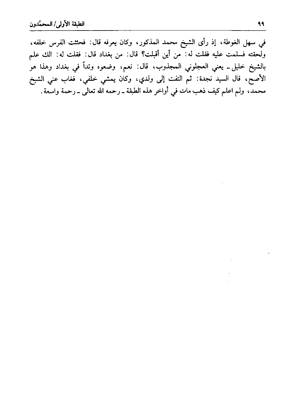 في سهل الغوطة، إذ رأى الشيخ محمد المذكور، وكان يعرفه قال: فحثثت الفرس خلفه، ولحقته فسلمت عليه فقلت له: من أين أقبلت. قال: من بغداد قال: فقلت له: الك علم بالشيخ خليل - يعني العجلوني المجنوب، قال: نعم، وضعوه وتداً في بغداد وهذا هو الأصح، قال السيد نجدة: ثم التفت إلى ولدي، وكان يمشي خلفي، فغاب عني الشيخ محمد، ولم اعلم كيف ذهب مات في أواخر هذه الطبقة - رحمه الله تعالى - رحمة واسعة.