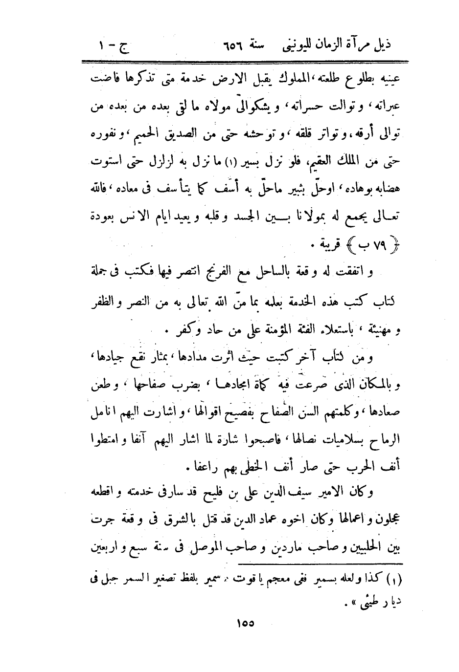 عينيه بطلوع طلعته، المملوك يقبل الأرض خدمة متى تذكرها فاضت عبراته، وتوالت حسراته، ويشكو إلى مولاه ما لقي بعده من بعده من توالي أرقه، وتواتر قلقه، وتوحشه حتى من الصديق الحميم، ونفوره حتى من الملك العقيم، فلو نزل بسير ما نزل به لزلزل حتى استوت هضابه بوهاده، أوحلّ بثبير ما حلّ به أسف كما يتأسف في معاده، فالله تعالى يجمع له بمولانا بين الجسد وقلبه ويعيد أيام الأنس بعودة قريبة.