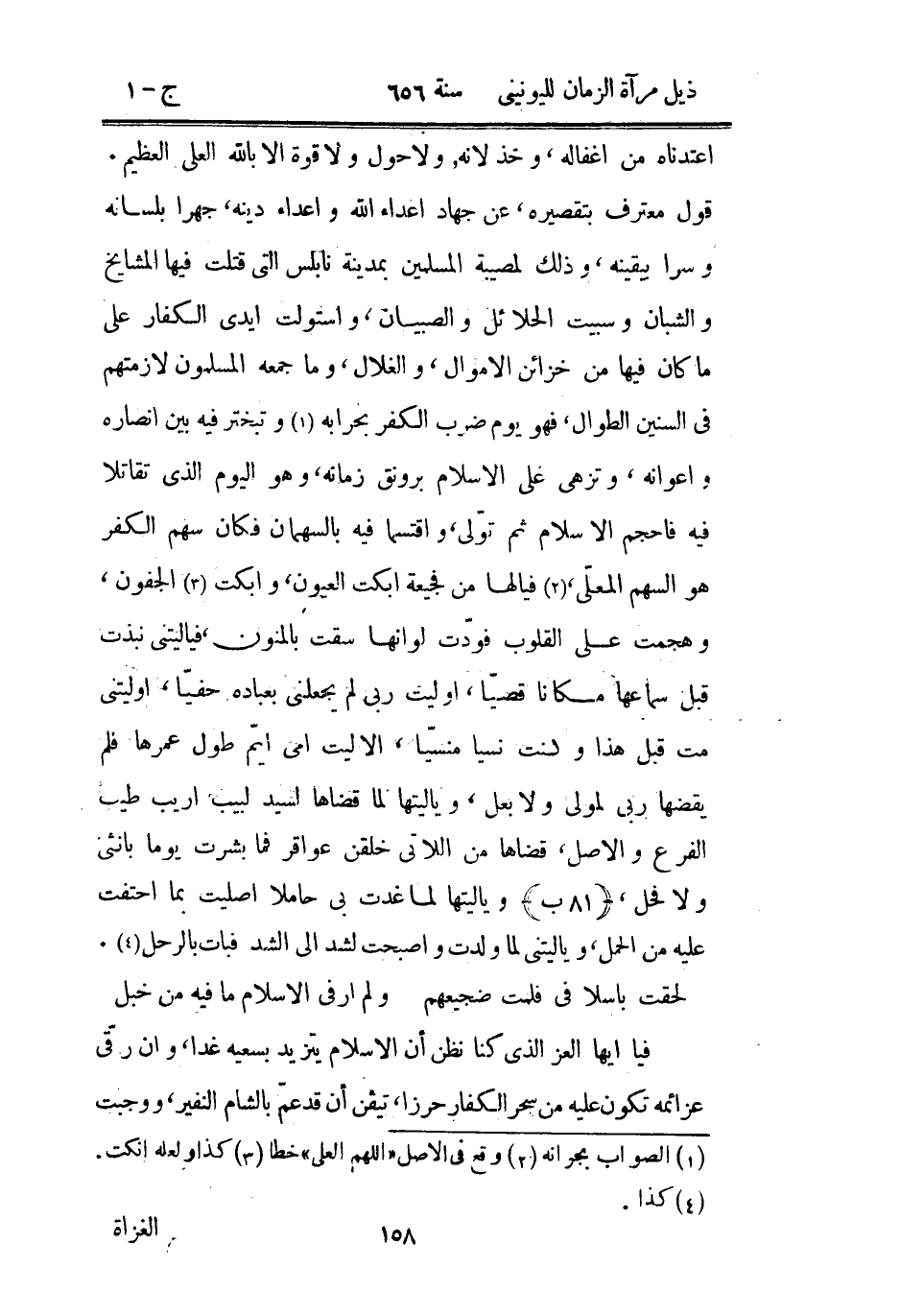 قول معترف بتقصيره، عن جهاد أعداء الله وأعداء دينه، جهراً بلسانه وسراً بيقينه، وذلك لمصيبة المسلمين بمدينة نابلس التي قتلت فيها المشايخ والشبان وسبيت الحلائل والصبيان، واستولت أيدي الكفار على ما كان فيها من خزائن الأموال، والغلال، وما جمعه المسلمون لازمتهم في السنين الطوال، فهو يوم ضرب الكفر بحرابه وتبختر بين أنصاره وأعوانه، وتزهى على الإسلام برونق زمانه، وهو اليوم الذي تقاتلا فيه فأحجم الإسلام ثم تولى، واقتسما فيه بالسهمان فكان سهم الكفر هو السهم المعلى، فيالها من فجيعة أبكت العيون، وأبكت الجفون، وهجمت على القلوب فودت لو أنها فودت لو أنها سقت بالمنون، فيا ليتني نبذت قبل سماعها مكاناً قصياً، أوليت ربي لم يجعلني بعباده حفيّا، أوليتني مت قبل هذا وكنت نسياً منسيّاً، ألا ليت أمي أيّم طول عمرها فلم يقضها ربي لمولى ولا بعل، وياليتها لما قضاها لسيد لبيب أريب طيب الفرع والأصل، قضاها من اللاتي خلقن عواقر فما بشرت يوماً بأنثى ولا قحل، - 81 ب - ويا ليتها لما غدت بي حاملاً أصليت بما احتفت عليه من الحمل، ويا ليتني لما ولدت وأصبحت لشد إلى الشد فبات بالرجل.