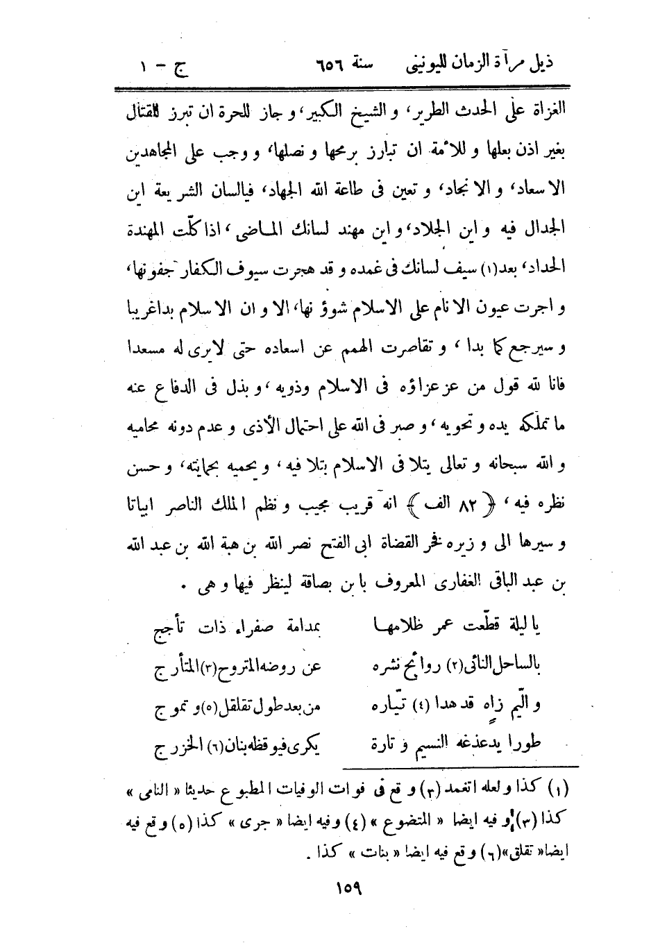 الغزاة على الحدث الطرير، والشيخ الكبير، وجاز للحرة أن تبرز للقتال بغير إذن بعلها وللأمة أن تبارز برمحها ونصلها، ووجب على المجاهدين الإسعاد، والإنجاد، وتعين في طاعة الله الجهاد، فيالسان الشريعة أين الجدال فيه وأين الجلاد، وأين مهند لسانك الماضي، إذا كلّت المهندة الحداد، بعد سيف لسانك في غمده وقد هجرت سيوف الكفار جفونها، وأجرت عيون الأنام على الإسلام شؤونها، إلا وأن الإسلام بدا غريباً وسيرجع كما بدا، وتقاصرت الهمم عن إسعاده حتى لا يرى له مسعداً فأنا لله قول من عز عزاؤه في الإسلام وذويه، وبذل في الدفاع عنه ما تملكه يده وتحويه، وصبر في الله على احتمال الأذى وعدم دونه محاميه والله سبحانه وتعالى يتلا في الإسلام بتلافيه، ويحميه بحمايته، وحسن نظره فيه، أنه قريب مجيب ونظم الملك الناصر أبياتاً وسيرها إلى وزيره فخر القضاة أبي الفتح نصر الله بن هبة الله بن عبد الله بن عبد الباقي الغفاري المعروف بابن بصاقة لينظر فيها وهي: