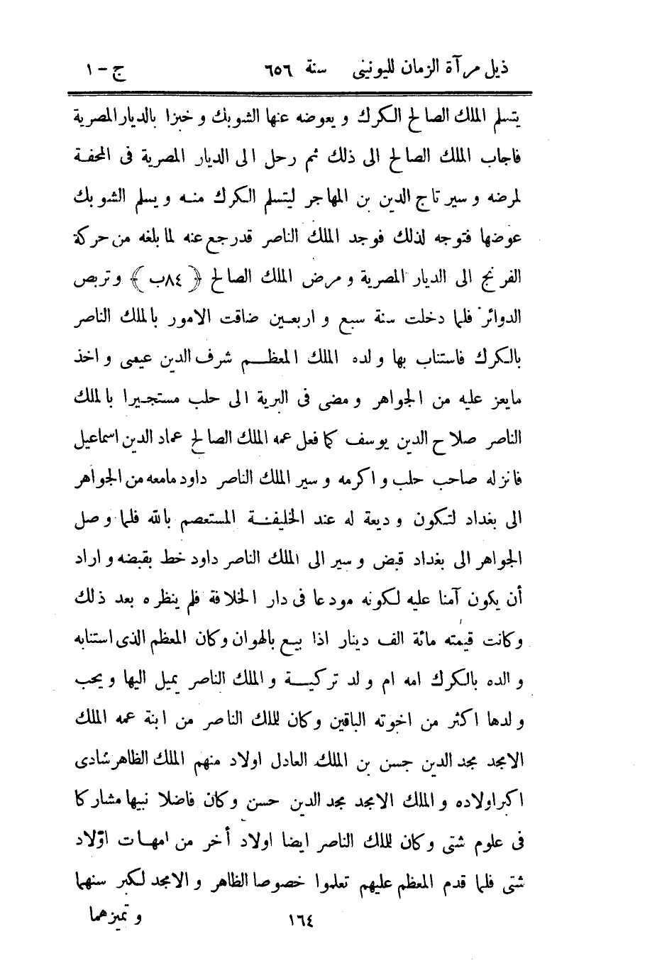 يتسلم الملك الصالح الكرك ويعوضه عنها الشوبك وخبزاً بالديار المصرية فأجاب الملك الصالح إلى ذلك ثم رحل إلى الديار المصرية في المحفة لمرضه وسير تاج الدين بن المهاجر ليتسلم الكرك منه ويسلم الشوبك عوضها فتوجه لذلك فوجد الملك الناصر قد رجع عنه لما بلغه من حركة الفرنج إلى الديار المصرية ومرض الملك الصالح وتربص الدوائر فلما دخلت سنة سبع وأربعين ضاقت الأمور بالملك الناصر بالكرك فاستناب بها ولده الملك المعظم شرف الدين عيسى وأخذ ما يعز عليه من الجواهر ومضى في البرية إلى حلب مستجيراً بالملك الناصر صلاح الدين يوسف كما فعل عمه الملك الصالح عماد الدين إسماعيل فأنزله صاحب حلب وأكرمه وسير الملك الناصر داود ما معه من الجواهر إلى بغداد لتكون وديعه له عند الخليفة المستعصم بالله فلما وصل الجواهر إلى بغداد قبض وسير إلى الملك الناصر داود خط بقبضه وأراد أن يكون آمناً عليه لكونه مودعاً في دار الخلافة فلم ينظره بعد ذلك وكانت قيمته مائة ألف دينار إذا بيع بالهوان وكان المعظم الذي استنابه والده بالكرك أمه أم ولد تركية الملك الناصر يميل إليها ويحب ولدها أكثر من إخوته الباقين وكان للملك الناصر من ابنة عمه الملك الأمجد مجد الدين حسن بن الملك العادل أولاد منهم الملك الظاهر شادي أكبر أولاده والملك الأمجد مجد الدين حسن وكان فاضلاً نبيهاً مشاركاً في علوم شتى وكان للملك الناصر أيضاً أولاد أخر من أمهات أولاد شتى فلما قدم المعظم عليهم تعلموا خصوصاً الظاهر والأمجد لكبر سنهما