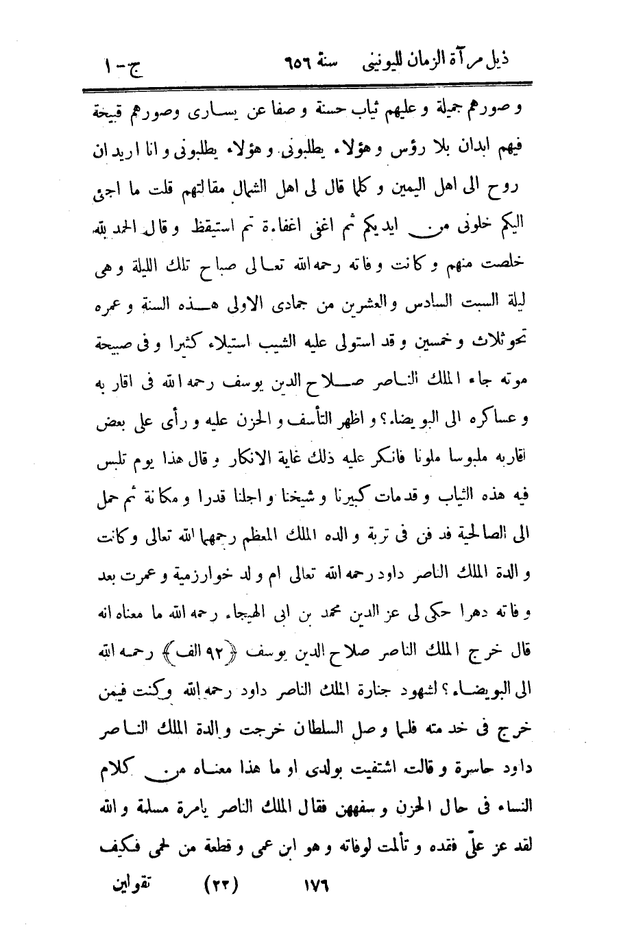 وصورهم جميلة وعليهم ثياب حسنة وصفاً عن يساري وصورهم قبيحة فيهم أبدان بلا رؤوس وهؤلاء يطلبوني وهؤلاء يطلبوني وأنا أريد أن أروح إلى أهل اليمين وكلما قال لي أهل الشمال مقالتهم قلت ما أجيئ إليكم خلوني من أيديكم ثم أغفى إغفاءة ثم استيقظ وقال الحمد لله خلصت منهم وكانت وفاته رحمه الله تعالى صباح تلك الليلة وهي ليلة السبت السادس والعشرين من جمادى الأولى هذه السنة وعمره نحو ثلاث وخمسين وقد استولى عليه الشيب استيلاء كثيرا وفي صبيحة موته جاء الملك الناصر صلاح الدين يوسف رحمه الله في أقاربه وعساكره إلى البويضاء وأظهر التأسف والحزن عليه ورأى على بعض أقاربه ملبوسا ملونا فأنكر عليه ذلك غاية الإنكار وقال هذا يوم تلبس فيه هذه الثياب وقد مات كبيرنا وشيخنا وأجلنا قدرا ومكانة ثم حمل إلى الصالحية فدفن هناك في تربة والده الملك المعظم رحمهما الله تعالى وكانت والدة الملك الناصر داود رحمه الله تعالى أم ولد خوارزميه وعمرت بعد وفاته دهراً حكى لي عز الدين محمد بن أبي الهيجاء رحمه الله ما معناه أنه قال خرج الملك الناصر صلاح الدين يوسف رحمه الله إلى البويضاء؟ لشهود جنازة الملك الناصر داود رحمه الله وكنت في من خرج في خدمته فلما وصل السلطان خرجت والدة الملك الناصر داود حاسرة وقالت اشتفيت بولدي أو هذا معناه من كلام النساء في حال الحزن وسفههن فقال الملك الناصر يا مرة مسلمة والله لقد عز علي فقده وتألمت لوفاته وهو ابن عمي وقطعة من لحمي فكيف